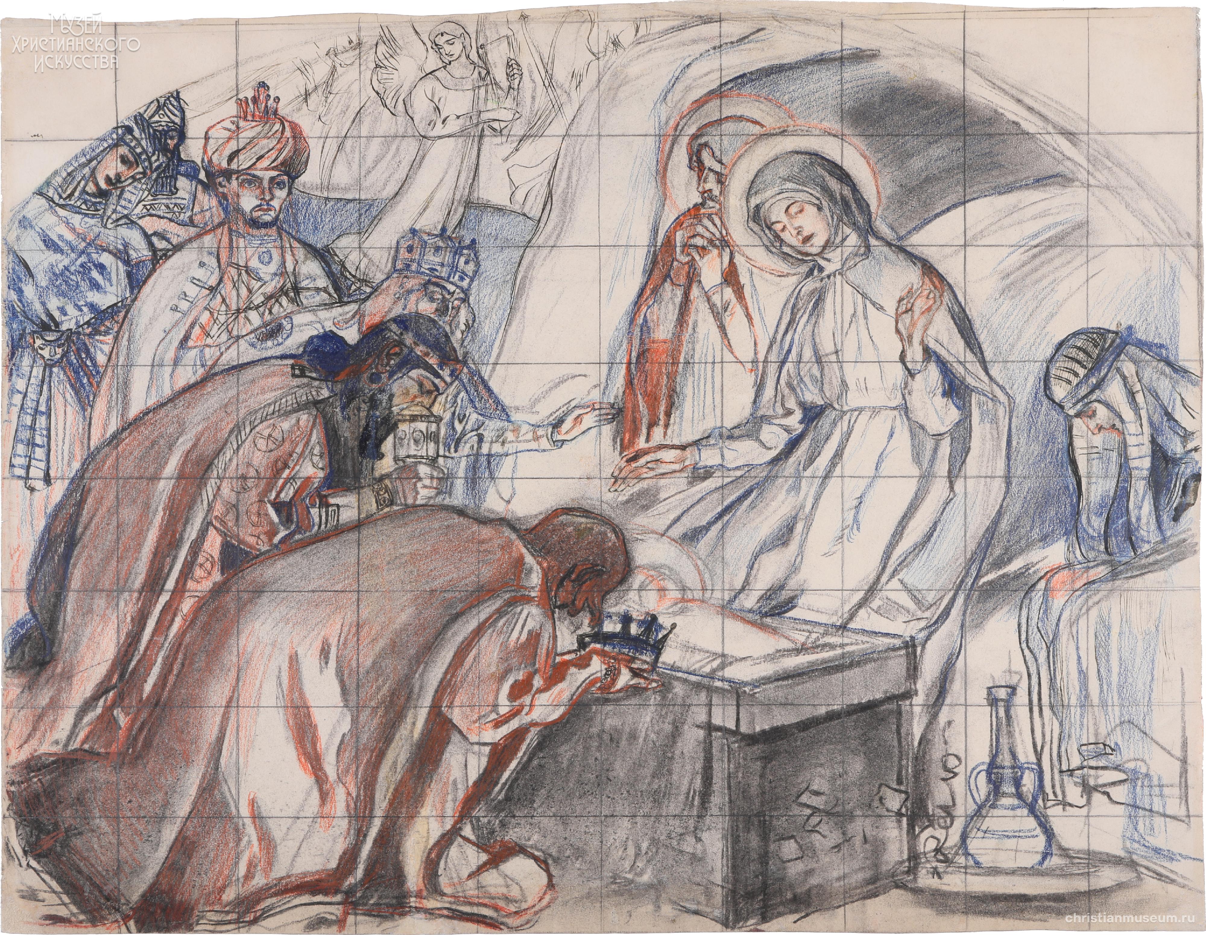 Рисунок синим и красным карандашом с изображением в центре яслей с новорожденным Младенцем. Справа сидит Пресвятая Богородица смотрящая на Сына, позади Нее святой праведный Иосиф со сложенными под подбородком руками. Слева коленопреклоненные волхвы и спутники их, склоненные над Младенцем и подносящие дары. Волхвы одеты в красочные одежды, с коронами на головах. Ближайший к яслям преподносит Христу корону. За волхвами намечанны фигуры парящих ангелов. Композицию справа заверщает фигура сидящего мужчины, около его ног блюдо и амфора.