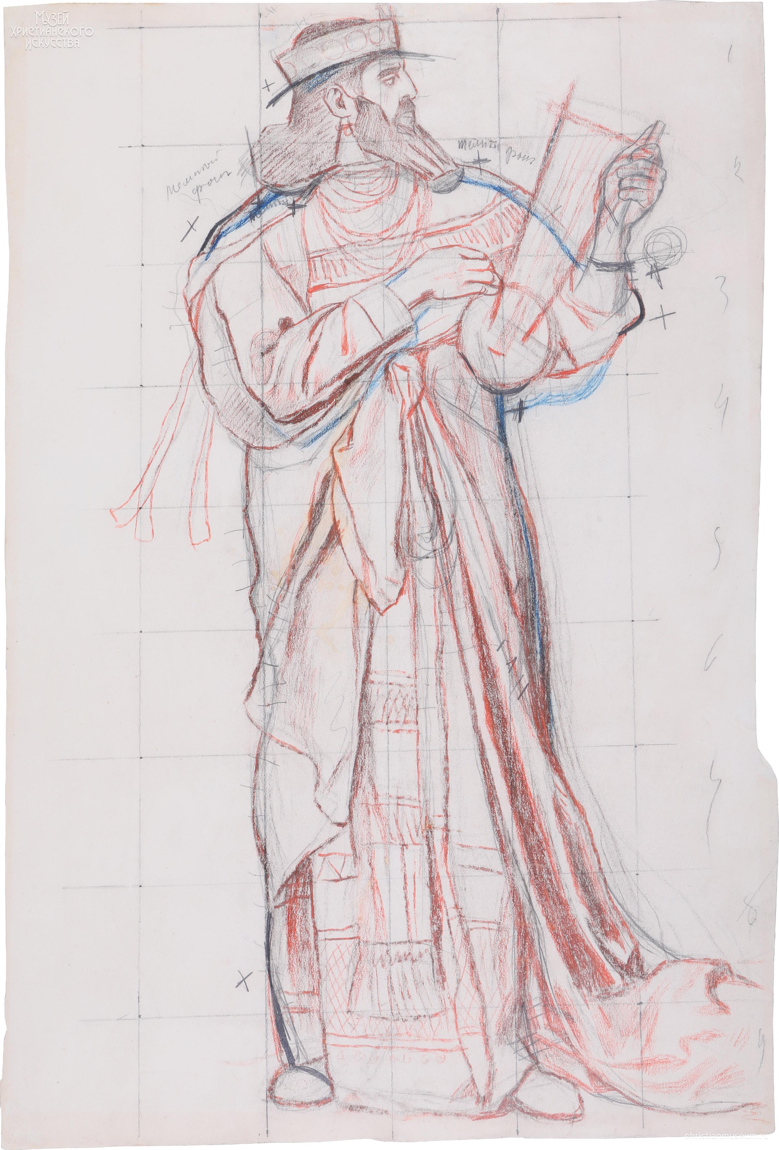 Рисунок красным и синим карандашами с ростовым изображением фигуры облаченного в длинные одежды царя Давида, стоящего в легком повороте влево, голова с короной повернута в профиль. В приподнятых руках арфа. На рисунок простым карандашом наложена масштабная сетка с пометами художника.