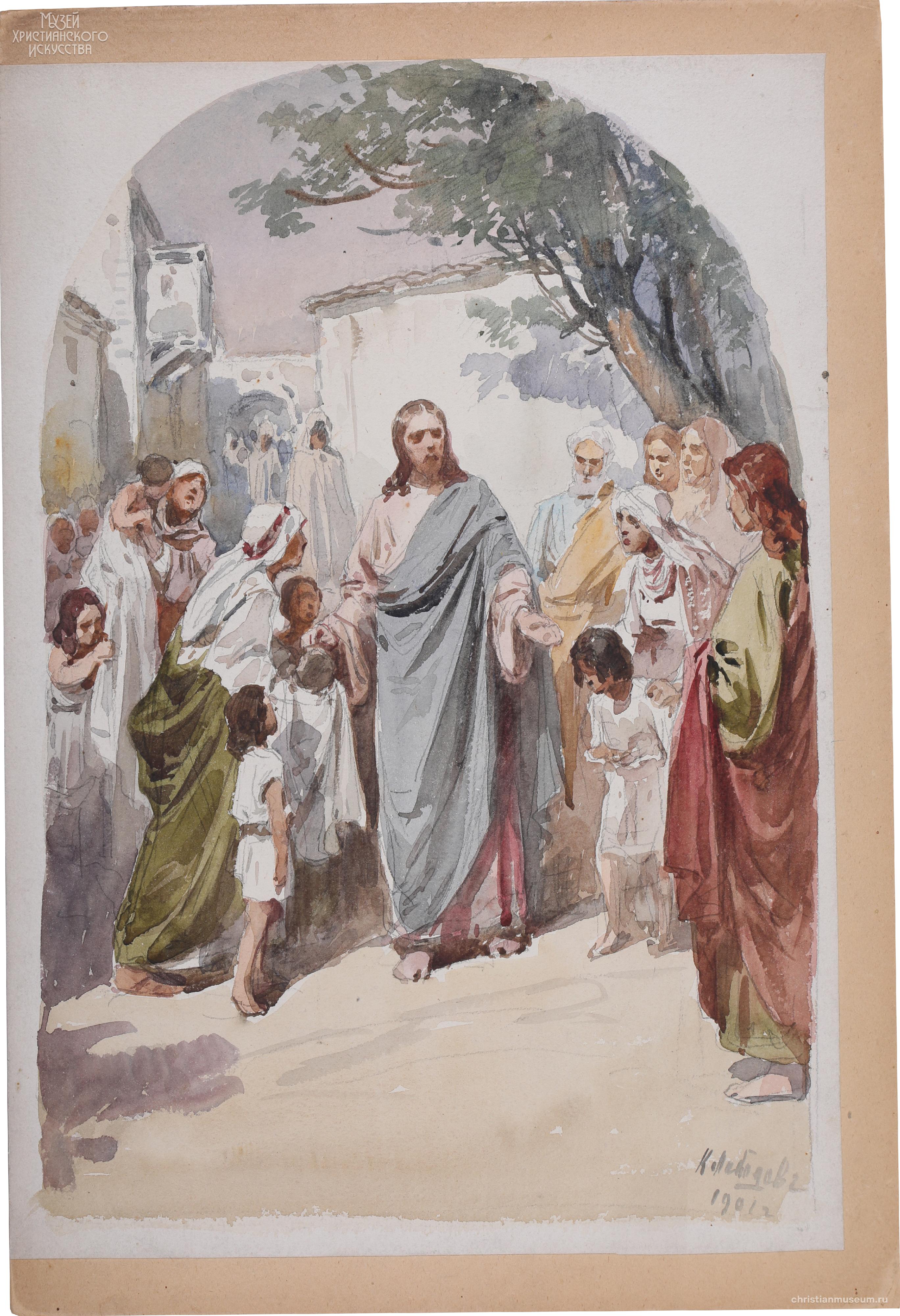 Рисунок акварелью с изображением в центре композиции фигуры Христа, идущего по городской улице среди народа. Люди подходят к нему, подводят детей. Изображение заключено в арку.