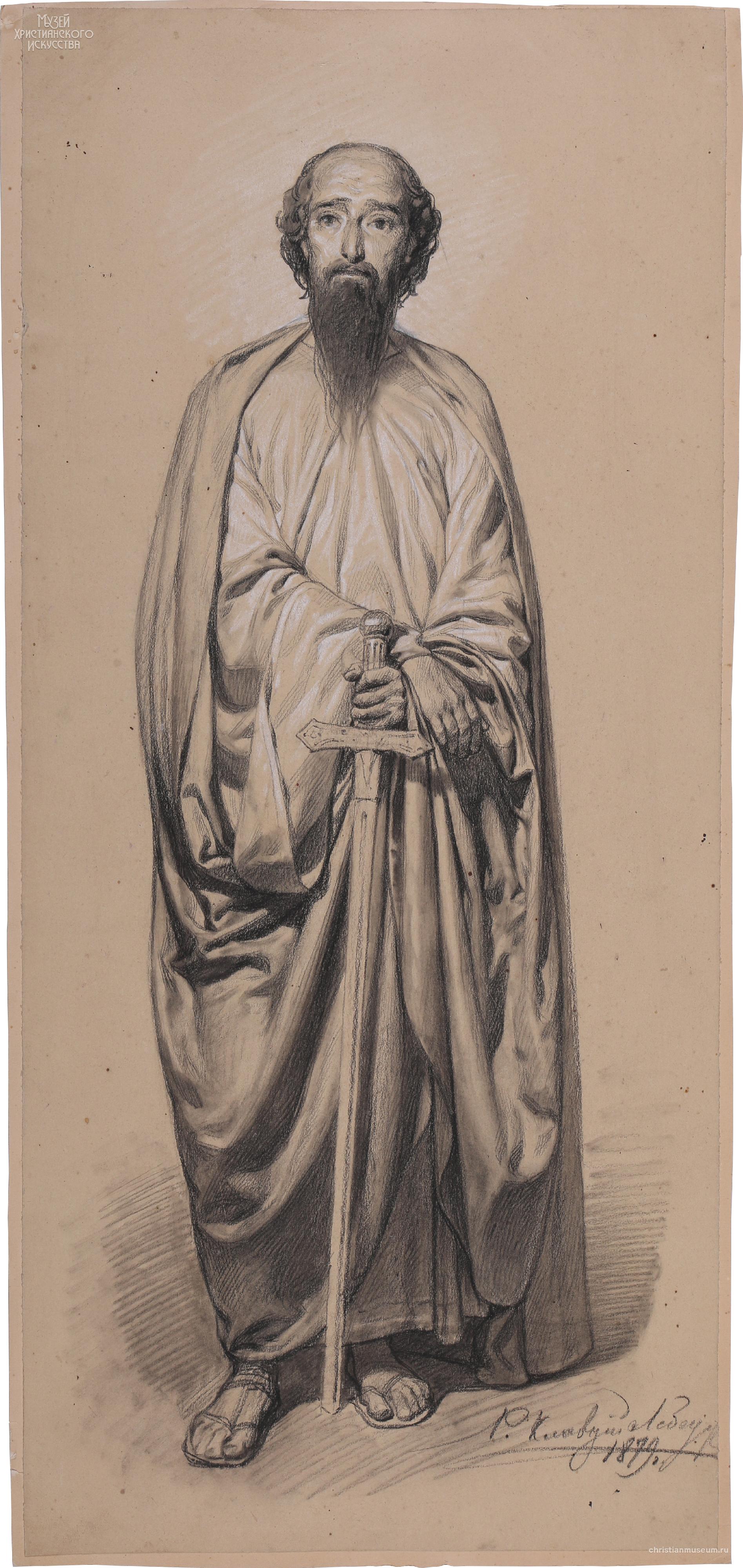 Рисунок с изображением фигуры Апостола Павла (?) в полный рост, стоящего прямолично и держащего перед собой левой рукой меч, опущенный вниз и упертый в позем, правая рука лежит на левой в перекрест. Облачен в хитон и плащ, на ногах сандалии.