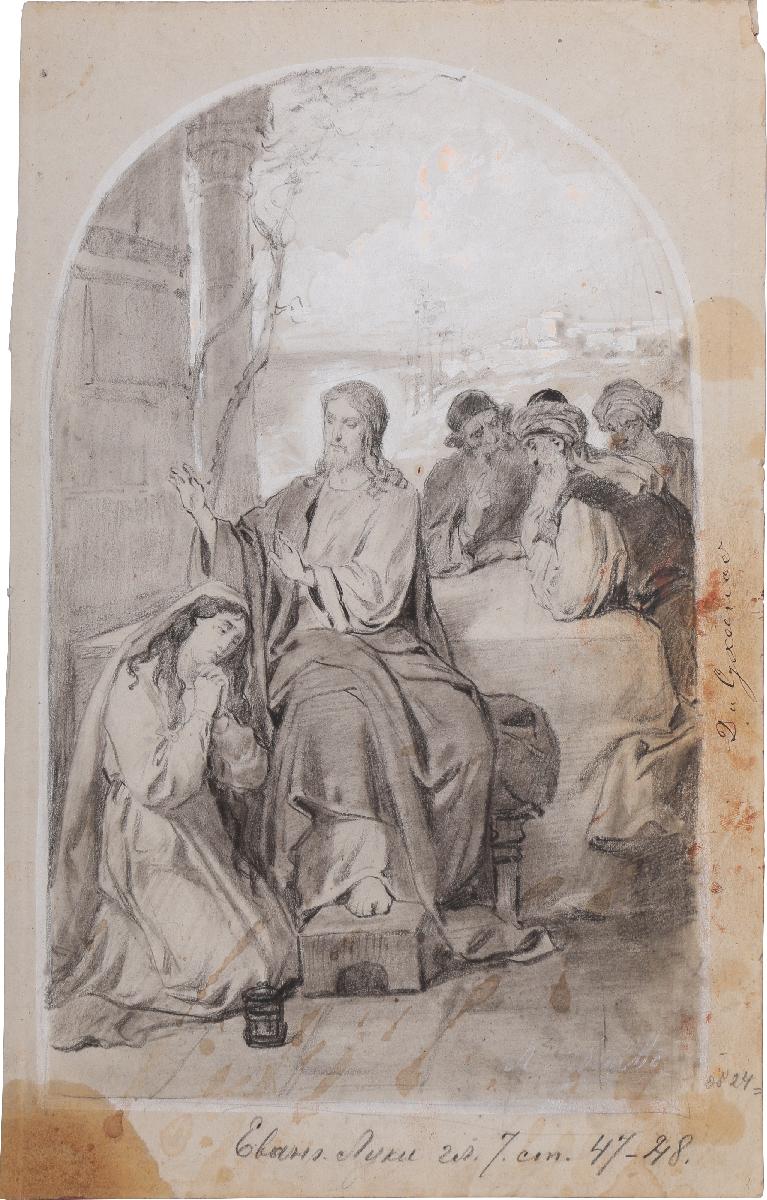 Рисунок с изображением сидящего около стола Спасителя, повернувшегося вправо к стоящей перед Ним на коленях женщине, сложившей молитвенно руки. На полу перед ней стоит чаша, Христос поставил правую ногу на скамеечку. За столом сидят фарисеи, наблюдающие сцену предстоящего омовения ног. Слева пространство первого плана ограничено частью здания с колонной, обвитой лозами. Вдали видны три креста для распятия и строения Иерусалима.