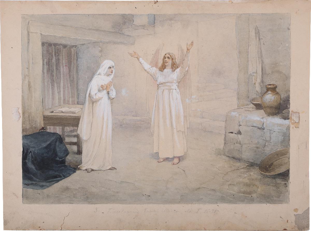 «3. Благовещенiе Божiей Матери. Лк. I. 26-38». На обороте в левом нижнем углу карандашом вертикально - «Благовещение».Иконография: