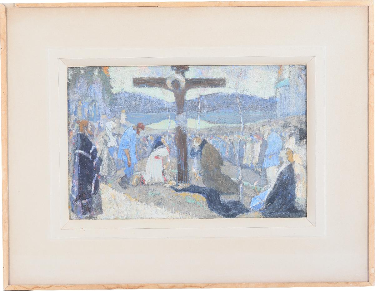 Эскиз представляет вариант к картине «Страстная седмица». В центре первого плана Распятие Господне, по сторонам которого в молитвенных позах, встав на колени, расположены - слева женская фигурка в белой крестьянской одежде и черном платке, за ней крестьянин в голубой рубахе; справа перед крестом стоящий на коленях Н.В. Гоголь в пальто с крылаткой цвета хаки, за ним несколько в стороне профильная фигура Л.Н. Толстого. Слева у края фигурка священника, за крестом и по сторонам большая людская толпа. Дали холмистые. Слева у края высокие ели, справа - часть храма.