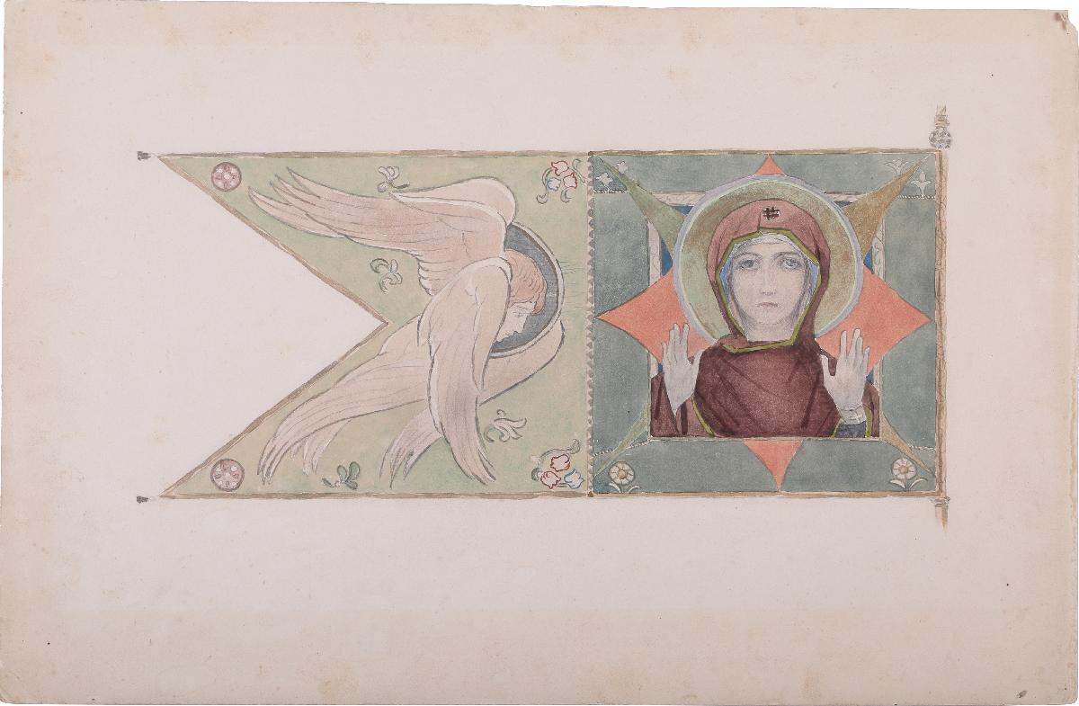 Рисунок с изображением эскиза лицевой стороны хоругви с фрагментом древка справа, к которому крепится полотно в форме флага с вырезанным треугольником в левой части. Хоругвь делится на две половины. Справа оплечный образ Пресвятой Богородицы с воздетыми руками. Голова Ее покрыта темно-красным покровом. Вокруг головы зеленовато-золотистый нимб. Образ Пресвятой Богородицы вписан в пересекающиеся ромб розово-оранжевого и квадрат синего цвета. В левой части хоругви образ Херувима, обращенного ликом к Пресвятой Богородицы. Над головой Херувима нимб. Хоругвь украшена разноцветными мелкими цветами по зеленоватому фону.