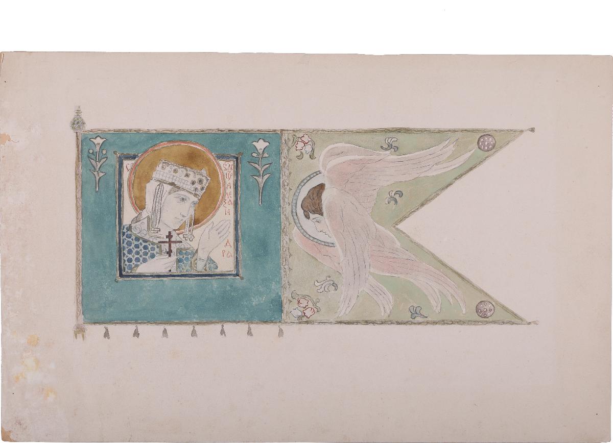 Рисунок с изображением эскиза оборотной стороны хоругви с фрагментом древка слева, к которому крепится хоругвь в форме флага с вырезанным в правой половине треугольником. По низу и углам справа хоругвь украшена кисточками. Хоругвь делится на две половины. Слева оплечное изображение святой царицы, на голове которой царский венец. В правой руке святая Александра держит небольшой восьмиконечный крест, приподнятая левая рука развернута ладонью к зрителю. Вокруг головы благоверной царицы широкий нимб. Слева и справа по сторонам головы красной краской надпись - «СВ - БЛГ//ЦЕ//А//ЛЕ//XА//Н//Д//РА». Образ обведен квадратной рамкой сине-голубого цвета с двумя цветочными веточками вверху. Справа на светло-зеленом с разноцветными мелкими цветами фоне образ Херувима, обращенного ликом к благоверной царице. Над головой Херувима светлый нимб.