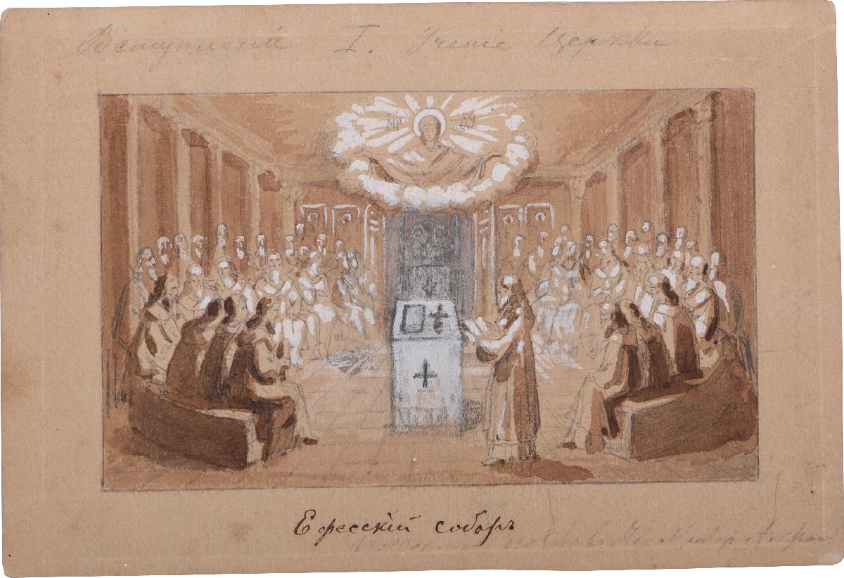 Рисунок с изображением заседания участников Эфесского собора. В длинном высоком храмовом зале с колоннадами вдоль стен двумя полукругами восседают епископы Церкви, обращенные друг к другу и Алтарю, установленному в центре. На дальней стене в нише большой образ Спасителя. Над собравшимися под сводами – образ Пресвятой Богородицы, воздевающей руки с покровом. Один из архиереев стоит и зачитывает по писанному.