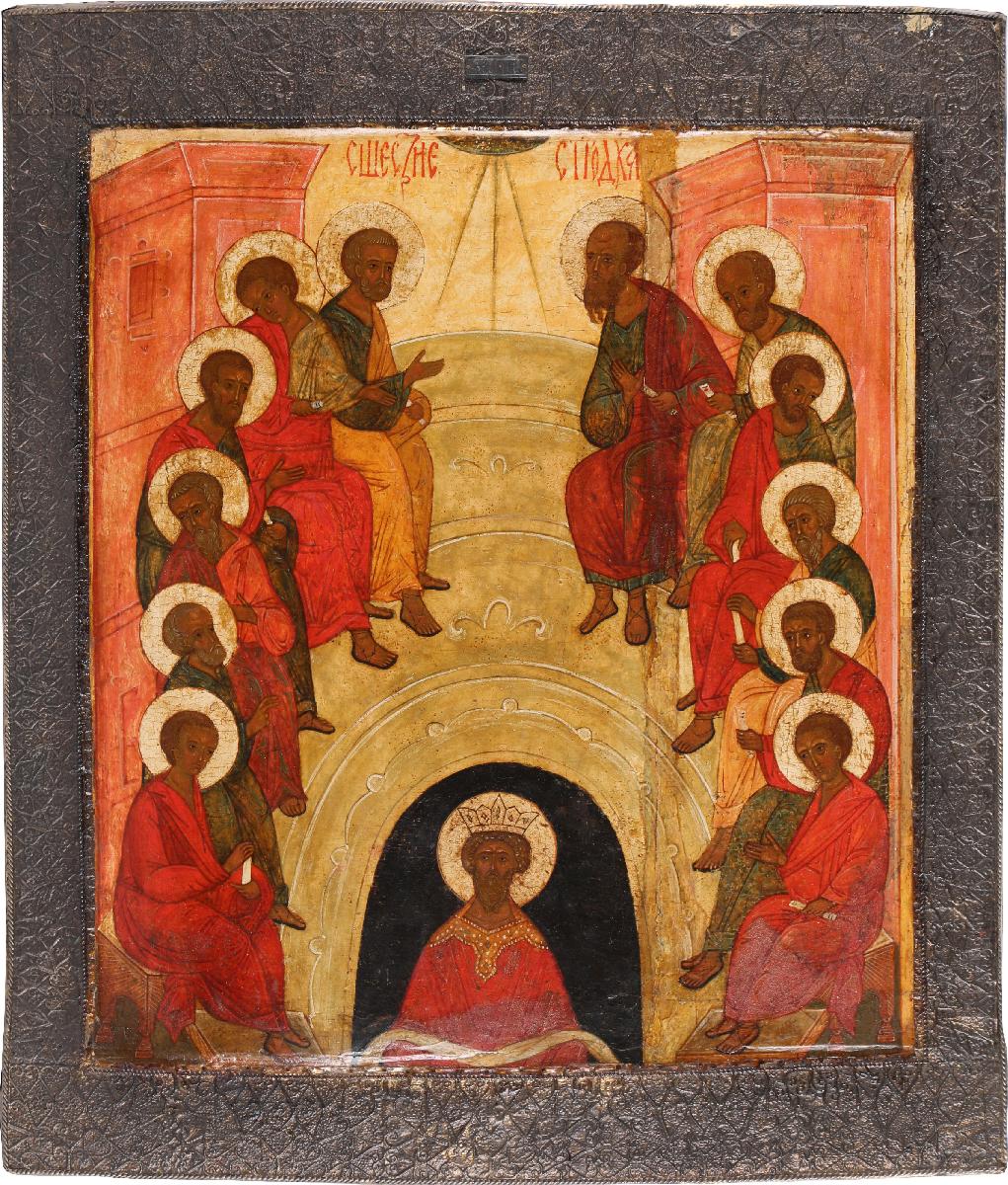 Изображение на иконе восходит к книге «Деяния апостолов» (2:1-13). В День Пятидесятницы, когда апостолы собрались вместе, исполнилось обетование, данное Иисусом Христом ученикам. На каждого из них снизошел Святой Дух, ниспосланный Богом Отцом в виде языка пламени, и апостолы обрели способность проповедовать учение Христа разным народам. Таким образом, миру раскрылось действие Пресвятой Троицы и было положено начало Церкви.