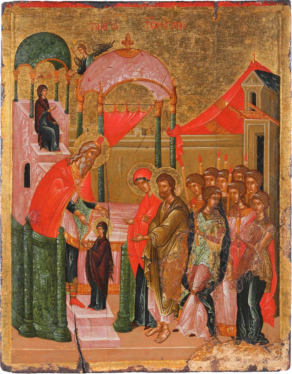 Древнейший текст, повествующий о событиях детства Марии, находиться в Протоевангелии Иакова (гл. VII, VIII). Первосвященник Захария встречает трехлетнюю деву Марию у Святая Святых Иерусалимского храма, обозначенного киворием, его завеса откинута; справа – сопровождающие Ее родители и девы со светильниками; вверху слева под вторым киворием – сцена питания Марии ангелом. Иконография сцены следует византийской традиции, сложившейся к концу X века.
