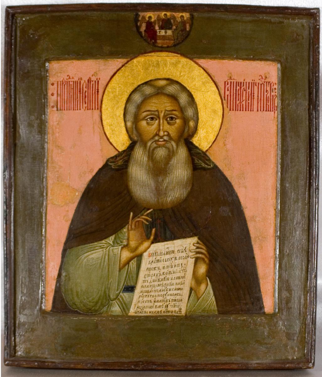 Святой представлен прямолично и одет в светло-зеленую рясу, темно-коричневую мантию, параман с куколем. На верхнем поле в сегменте изображена Ветхозаветная Троица. Правая рука святого воздета в пророческом жесте, левой преподобный придерживает развернутый свиток с завещанием братии монастыря: «Внемлите себе// братие, всех молю// прежъ имейте//страх Божий и чисто//ту душевную и любовь//нелицемерную к сим//и страннолюбие и сми//рение с покорением//пост и молитву пищу//и питие в меру чести//и славы не любите и паче». Священническое достоинство преподобного подчеркивается редким иконографическим решением - тонзурой на голове. Тщательная моделировка выразительного лика, аккуратно уложенных волос и бороды подчеркивает монументальность образа. Личное исполнено в традициях живоподобной манеры свойсвенное мастерам Оружейной палаты.