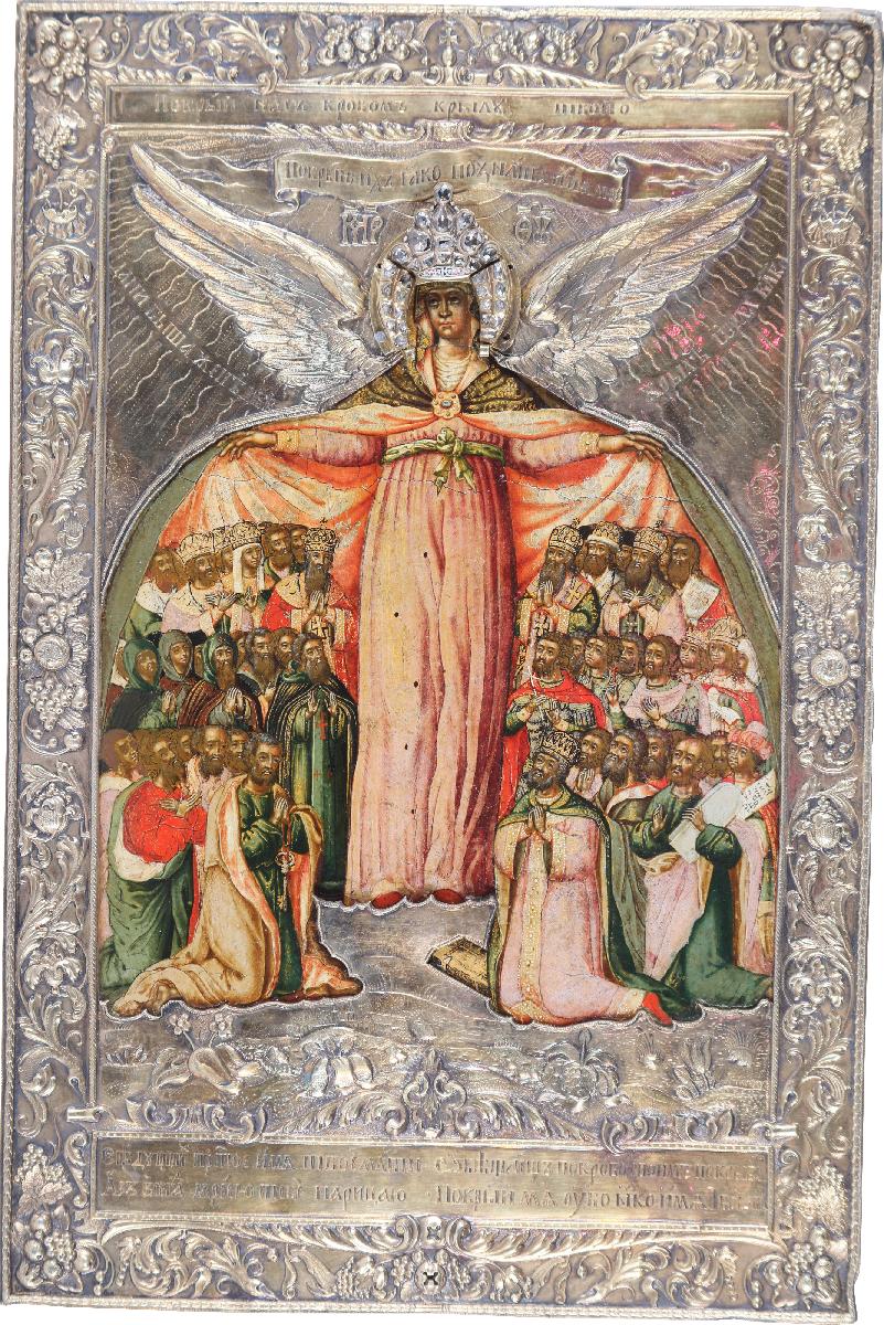 Икона Богоматери «Покрый нас кровом крылу Твоею» является редкостным по художественному качеству и уникальным по иконографии памятником петровского времени. В этой иконе в качестве образца использована украинская книжная гравюра из книги святителя Димитрия Ростовского «Руно Орошенное».