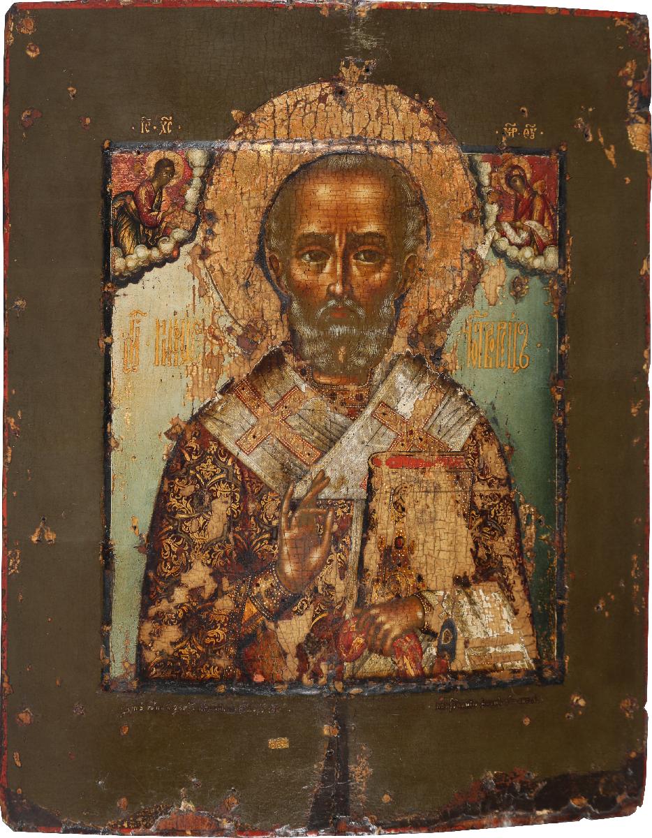 Святитель изображен фронтально, по пояс, с благословляющей десницей и закрытым Евангелием, которое он придерживает левой рукой. В руке святитель сжимает ярко-красный плат. Святитель облачен в покрытую плотным крупным орнаментом фелонь и белый омофор, перекинутый через левую руку. В верхних углах композиции - облачные сегменты с образами Спасителя с Евангелием и Богоматери с омофором (так называемое Никейское чудо). Личное письмо исполнено в соответствии с принципами «живоподобия»: с постепенным насыщением белилами охры и плавными переходами от теневых мест к освещенным. Одежды святителя и оклад Евангелия сплошь покрыты тончайшим орнаментом, в котором обильно использованы золото и цветные лаки, благодаря чему создается эффект подлинной драгоценности живописной поверхности.