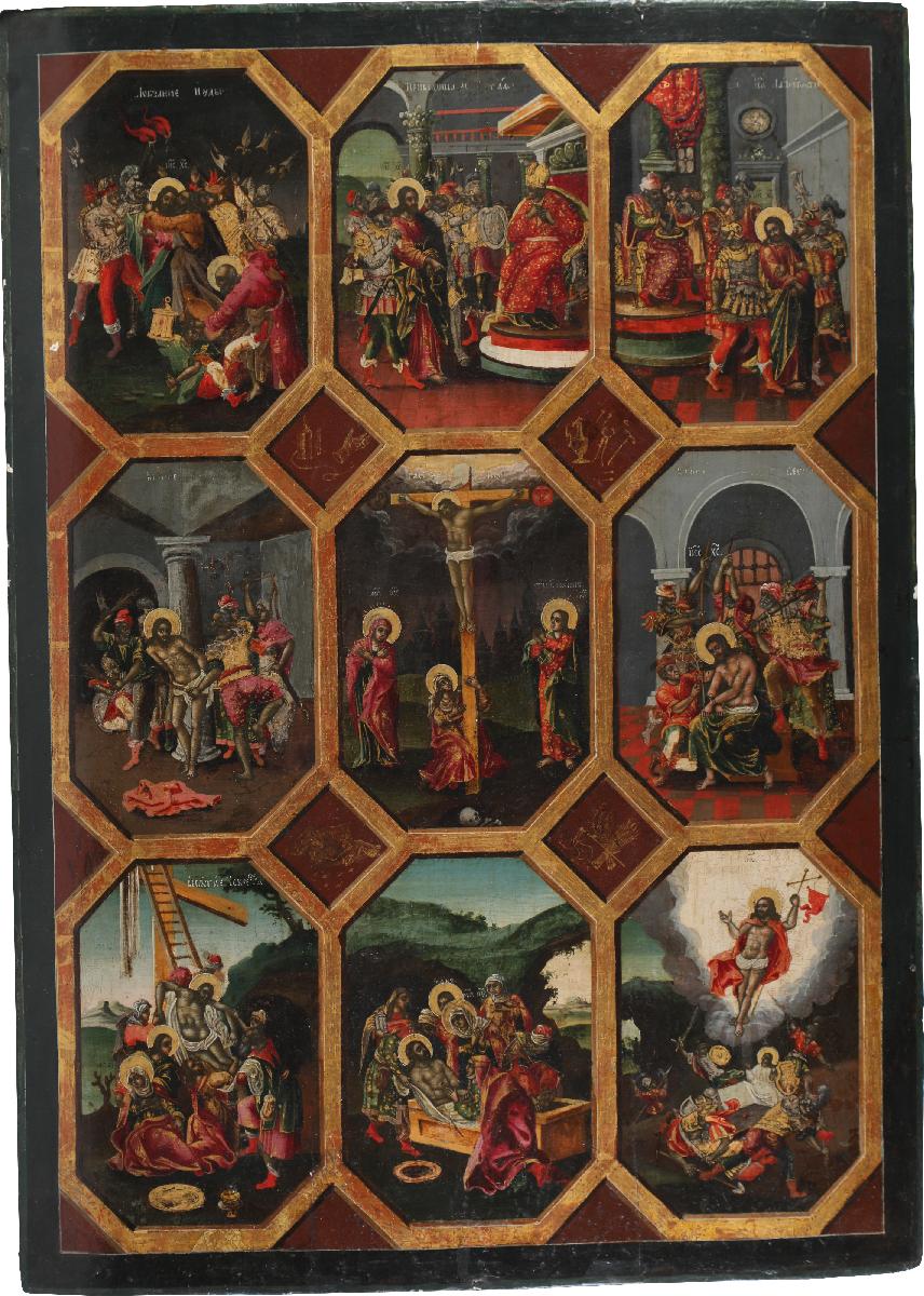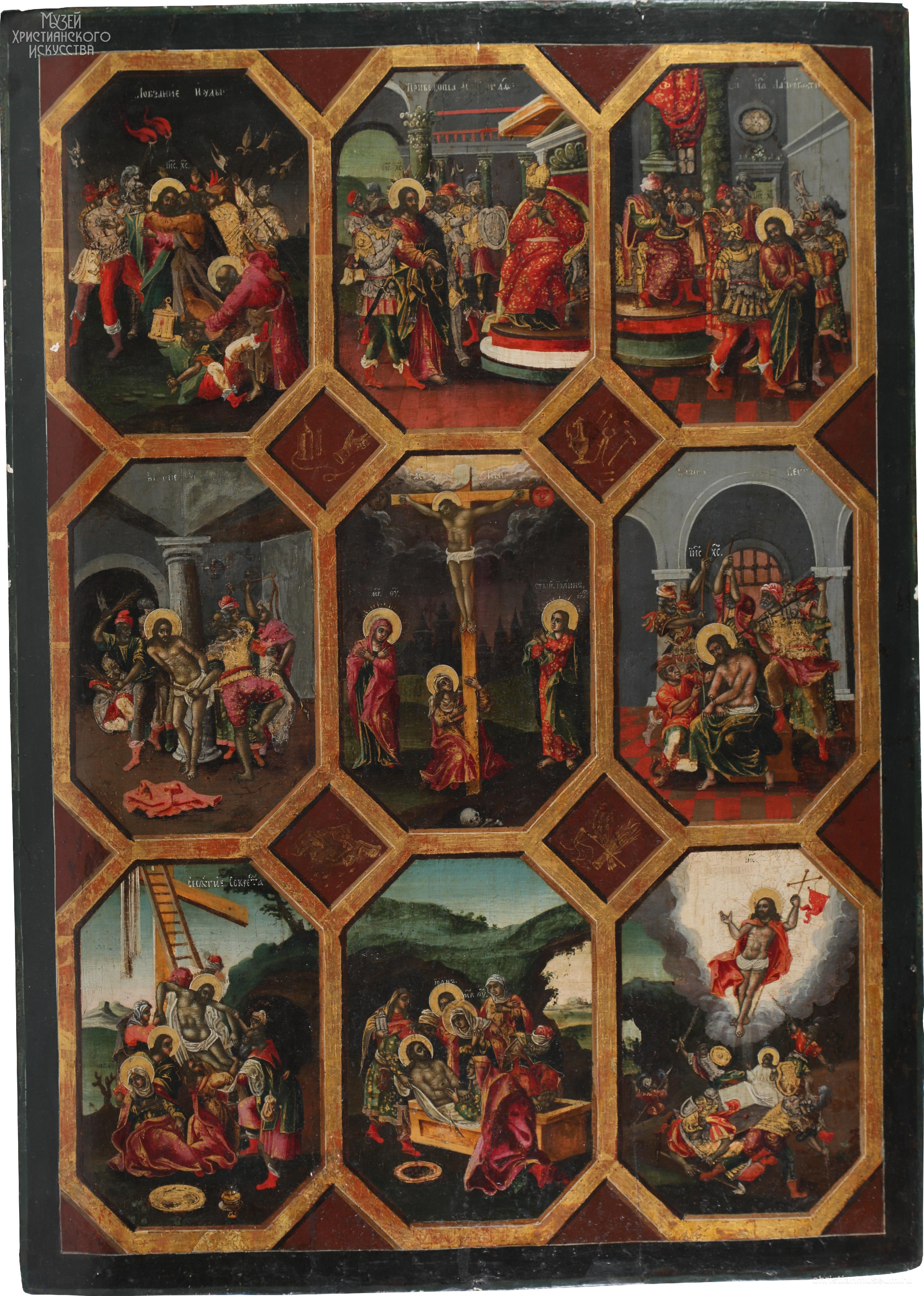 Икона состоит из девяти равновеликих восьмигранных клейм. В центре композиции помещено «Распятие». В остальных клеймах - сцены Страстей Христовых: «Поцелуй Иуды», «Приведение к Каиафе», «Бичевание», «Увенчание тернием», «Снятие со Креста», «Положение во гроб», «Воскресение» (в типе «Восстания от гроба»).