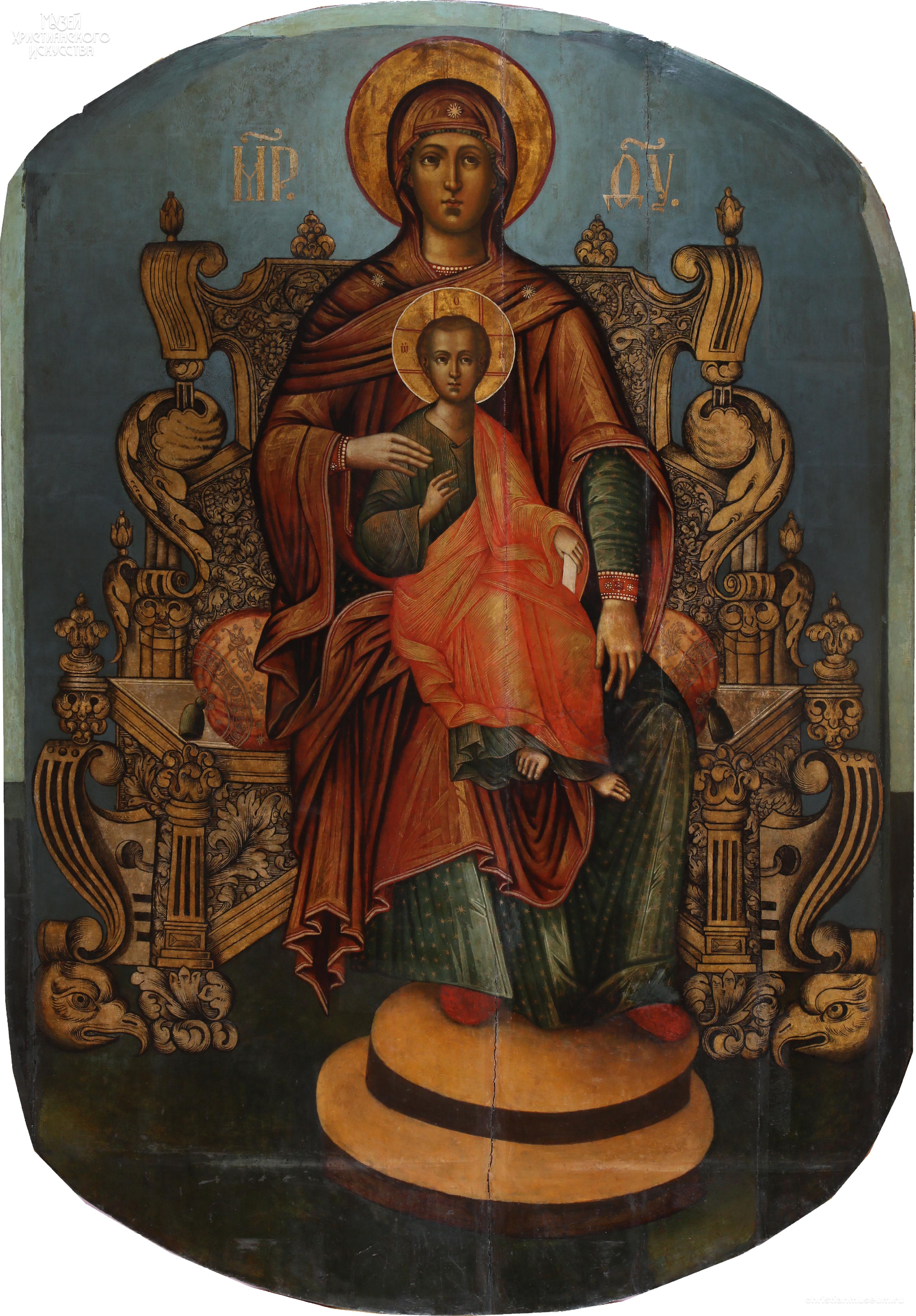 Богоматерь с Младенцем восседает на троне, придерживая Сына за правое плечо. Младенец в левой руке держит свернутый свиток, правая рука сложена в пророческом жесте. Трон богато орнаментирован узором который выполнен черневым рисунком по золотому и серебряному фону. Иконографически икона идентична образу из местного ряда иконостаса Покровского храма Московской духовной академии, который прежде являлся средником пророческого ряда иконостаса храма Харитона Исповедника в Москве.