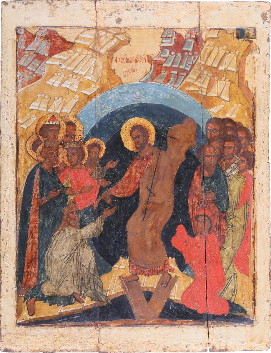 В центре композиции изображен Христос в ярко-синей круглой славе, стоящий на вратах ада и протягивающий руку праотцу Адаму, упавшему на колени. Справа с покровенными руками на коленях стоит праматерь Ева в ярко-красных одеждах. За спинами прародителей изображены ветхозаветные праведники. За ними возвышается цветные горки охристого и красно-коричневого цвета с белильной и разбеленной голубой разделкой лещадок. Подобная тесно скадрированная композиция встречается на иконах среди памятников Русского Севера. Стиль живописи с прозрачным колоритом и характерным голубым в сочетании с охрами указывает на принадлежность к этому региону, к землям, исторически тяготевшим к Ростову в силу подчинения ростовской епархии.