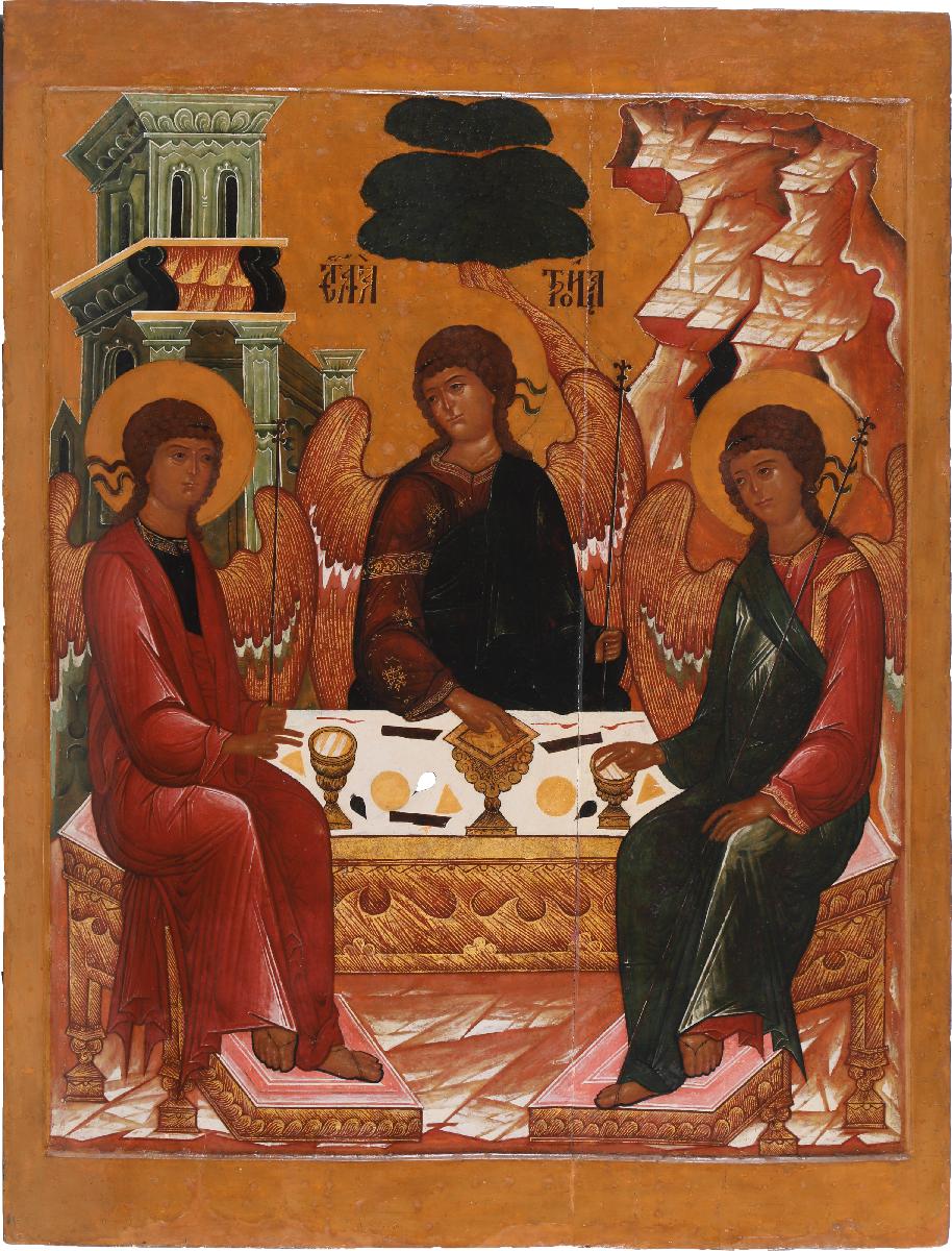 Публикуемый памятник принадлежит к изводу, который появился на Руси после написания «Троицы» преподобным Андреем Рублевым. Это тип изображения Ветхозаветной Троицы, где отсутствуют бытовые подробности сюжета: мы не видим праведного Авраама и его жены Сарры, отсутствует сцена заклания тельца, атрибуты трапезы сведены к минимуму. Внимание сосредоточено на безмолвной сцене общения трех ангелов. А фон лишь подчеркивает вневременное пространство происходящего таинства. Здание, Мамврийский дуб и скала – максимально лаконичны.