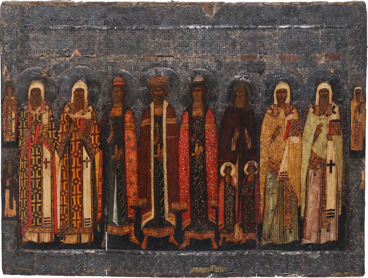 На иконе представлены московские, ростовские и ярославские святые – князья и архиереи, преподобные. Надписи не сохранились, имена святых определены по иконографии. На левом поле святитель Иона митрополит Московский, преподобный Авраамий Ростовский на правом – святитель Исайя Ростовский. В среднике слева направо: святители Петр и Алексий митрополиты Московские, святые благоверные князья Владимир, Борис и Глеб, святые ярославские князья Федор, Давид и Константин, святители Леонтий и Игнатий Ростовские.