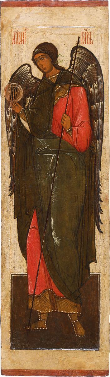 Ростовая икона архангела Гавриила и парная ей икона архангела Михаила происходят из деисусного чина иконостаса неизвестной церкви. Архангел представлен в рост в красном хитоне с широкими каймами на плечах и подоле, в руке он держит жезл и зерцало с монограммой Христа. Зеленый плащ архангела застегнут у шеи и переброшен через руку. Драпировка ткани на нем представляет весьма редкое соединение двух приемов написания плащей, один из которых был распространен в Новгороде (перекинутый через руку плащ и свободное плечо) и Москве (застежка).