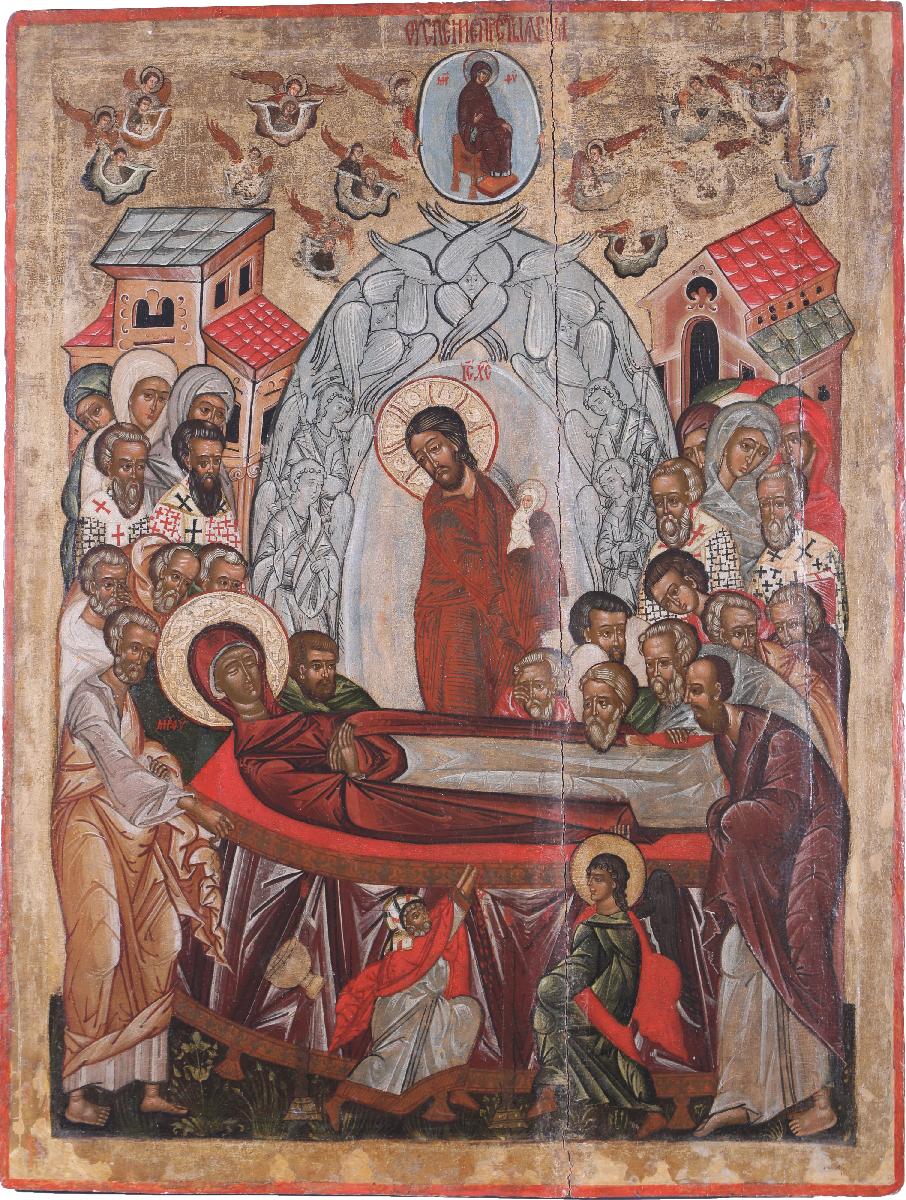 Икона относится к развернутому или так называемому «облачному» варианту иконографии - помимо Богоматери на ложе, оплакивающих ее апостолов и Христа, спустившегося с небес за душой Богоматери, здесь представлено путешествие апостолов на облаках в Иерусалим, в дом Иоанна Богослова. В верхней части композиции изображена возносящаяся Богоматерь в Славе, поддерживаемая ангелами. Среди апостолов, обступающих ложе, представлены четверо святителей – Иаков Иерусалимский, Иерофей Афинский, Дионисий Ареопагит, Тимофей Эфесский и иерусалимские жены. Перед ложем Богоматери изображен ангел, наказывающий отсечением рук нечестивого иудея Авфонию, который дерзнул прикоснуться к Ее ложу во время вынесения тела из Иерусалима в Гефсиманию на место погребения.