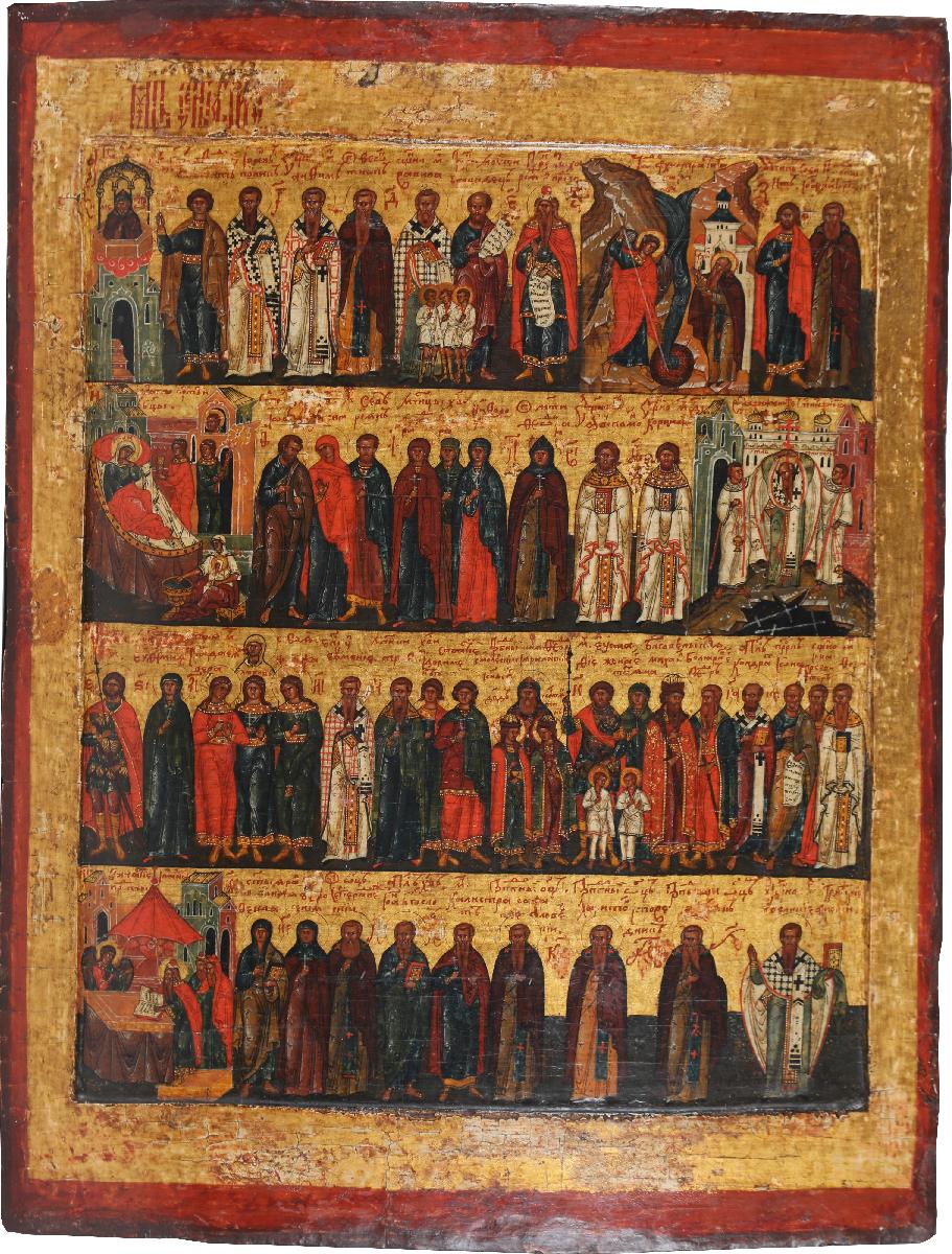 Минея - икона с изображениями праздников и святых, память которых приходится на определенный месяц. Композиция, как правило, делится на несколько рядов, в каждом из которых изображения помещаются в календарной последовательности. Надписи с именами святых, название праздников и числа дней пишутся на церковно-славянском языке и соответствуют старому стилю.