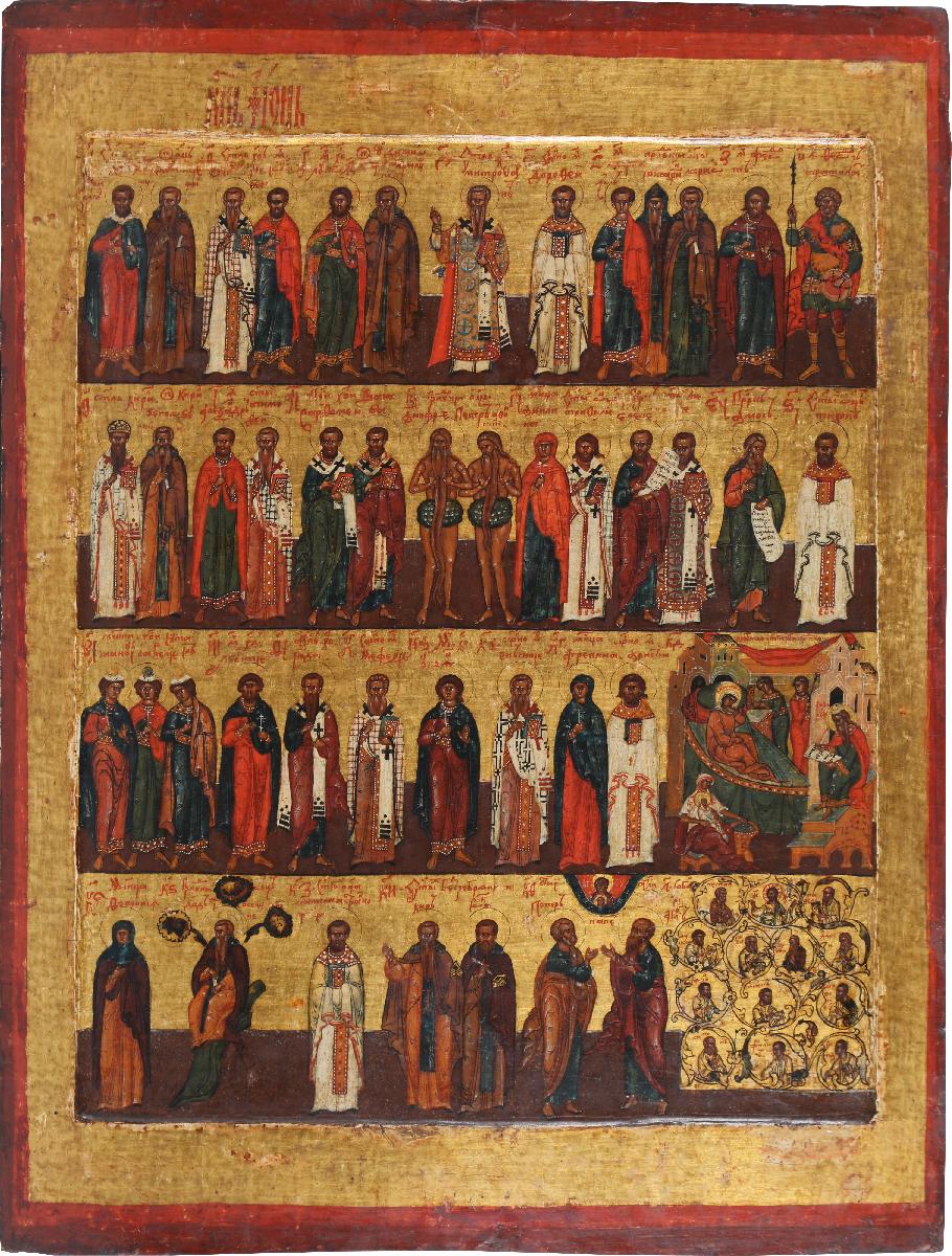 Слева направо порядно изображены: Мч. Иустин Философ, Прп. Дионисий, игумен Глушицкий; Свт. Никифор исп., патриарх Константинопольский, Вмч. Иоанн Новый, Сочавский; Мч. Лукиллиан. Прп Димитрий(?); Свт. Митрофан, патриарх Константинопольский; Сщмч. Дорофей, еп. Тирский; Мч(?), Прп. Виссарион, чудотворец Египетский, Прп. Иларион Новый, из обители Далматской; Сщмч. Феодот Анкирский; Вмч. Феодор Стратилат//