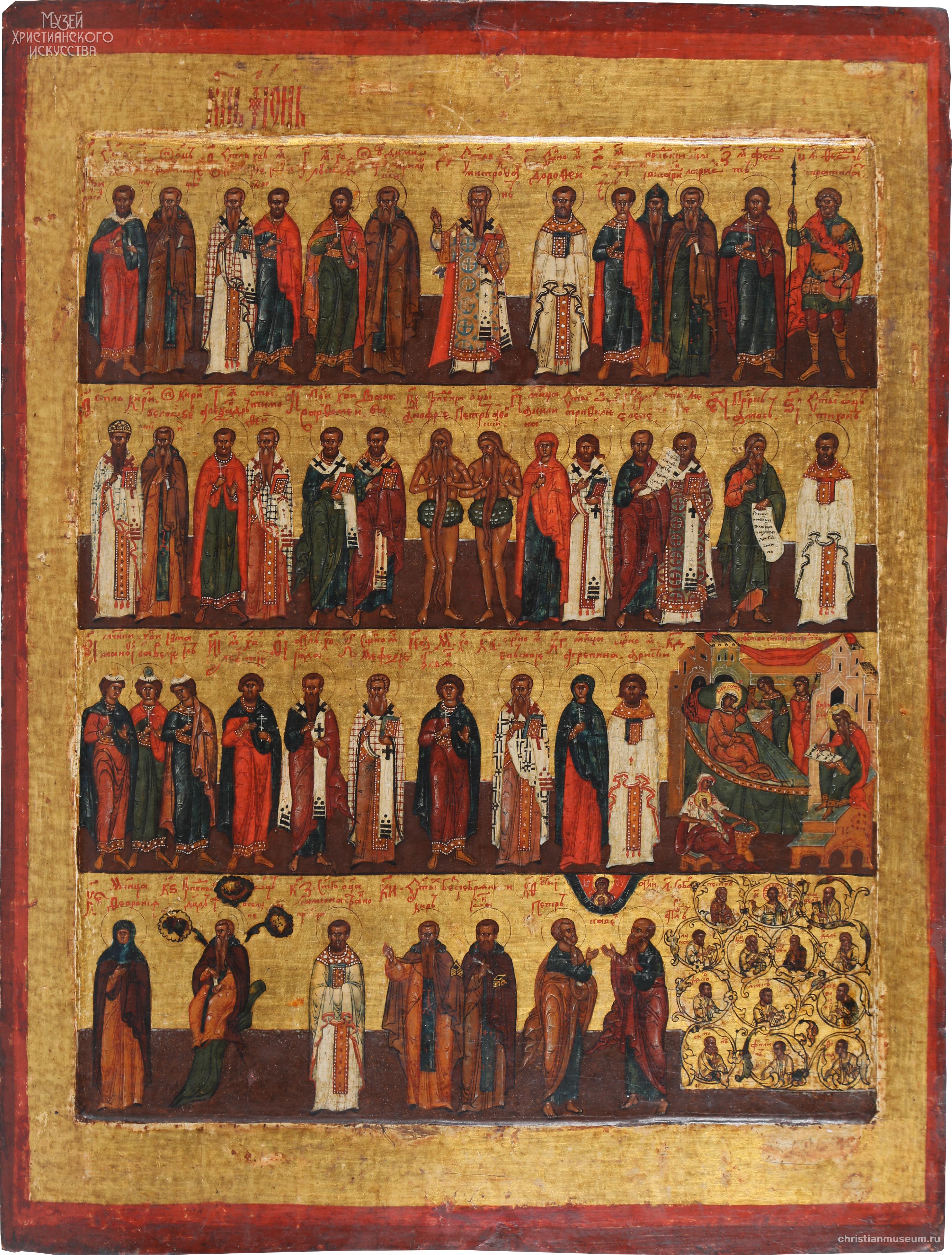Минея - икона с изображениями праздников и святых, память которых приходится на определенный месяц. Композиция, как правило, делится на несколько рядов, в каждом из которых изображения помещаются в календарной последовательности. Надписи с именами святых, название праздников и числа дней пишутся на церковно-славянском языке и соответствуют старому стилю.