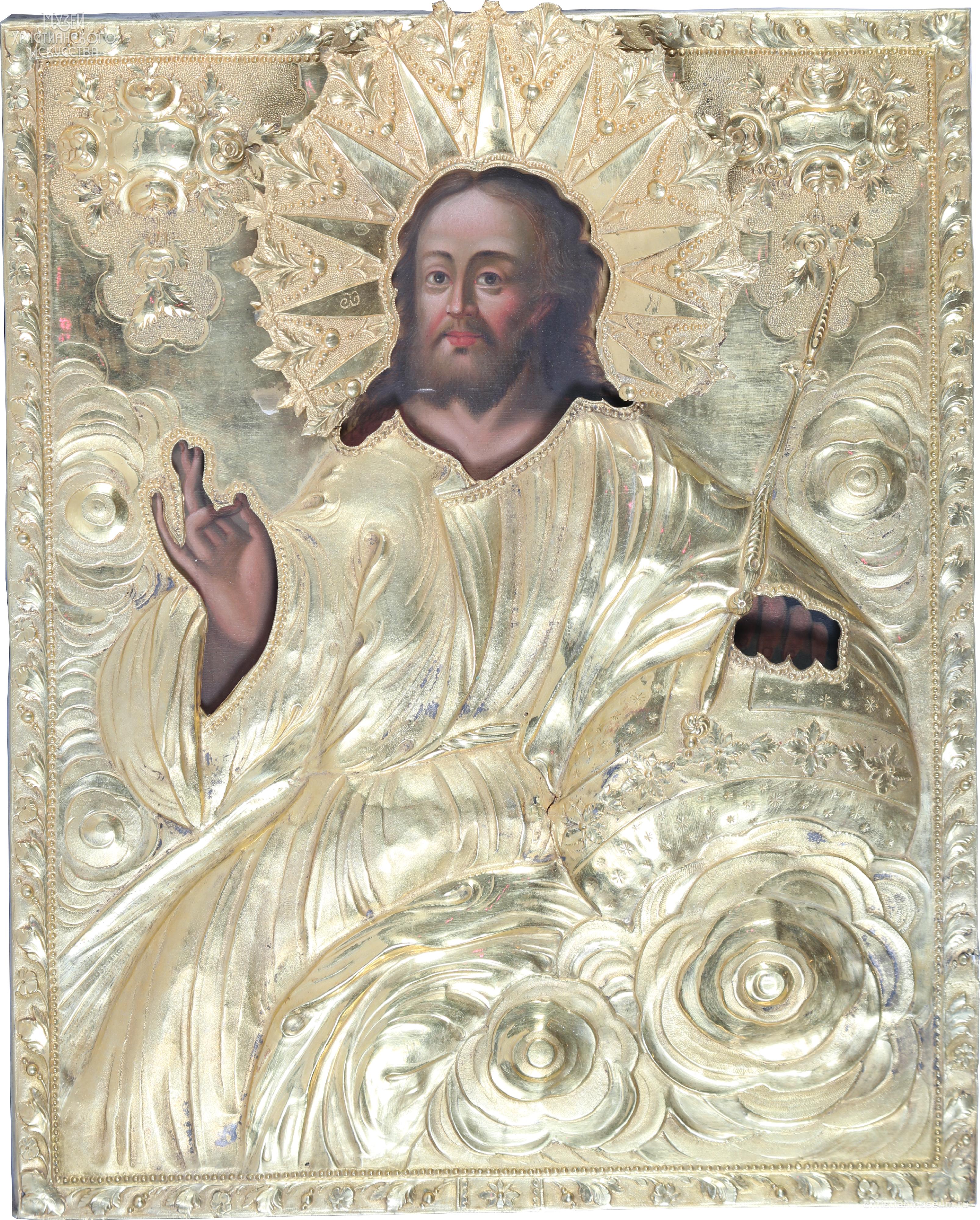Оклад закрывает всю поверхность, оставлены прорези для личного. Поля украшены регулярным орнаментом из перемежающихся листьев и цветов, граница со средником обозначена полосой жемчужника. Фон гладкий, По обеим сторонам от Спасителя рельефные фигурные картуши с гравированной надписью декорированы цветочными гирляндами, расположенными на канфаренных фигурных участках. Одежды Спасителя, скипетр и держава в Его левой руке и облака выполнены в высоком рельефе. В левой руке Спасителя раскрытое Евангелие с текстом, повторяющим имеющийся на иконе. Венец накладной, с фигурным завершением, декорирован сложным узором из гладких копьевидных лучей, перемежающихся с растительным рельефным орнаментом с гирляндами. Появление подобных венцов связано с распространением классицизма в конце XVIII – начале XIX века. Наиболее близкие аналогии рассматриваемому памятнику находятся среди иконных окладов этого времени.