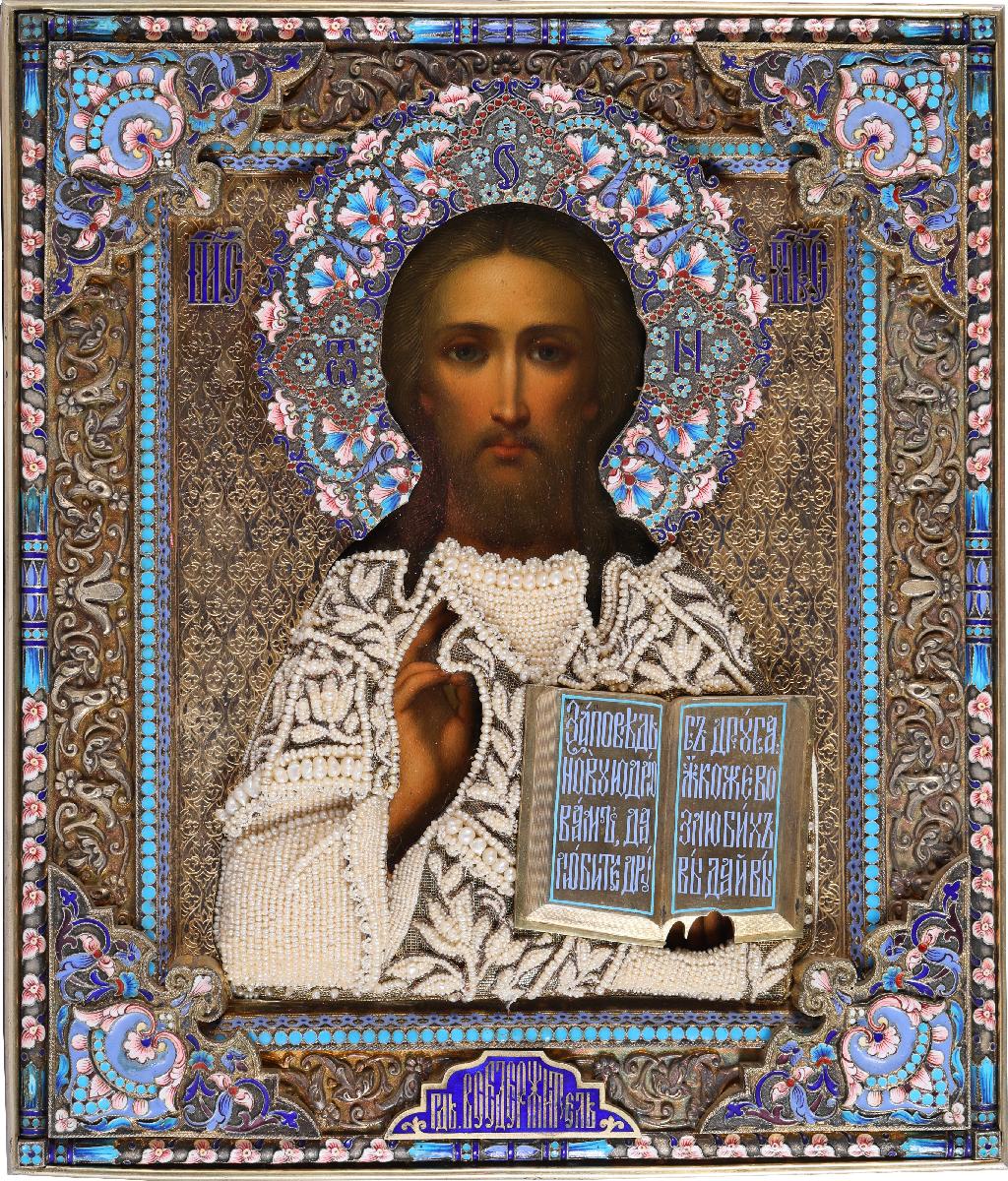 Декоративный убор иконы дополняет шитая жемчужная риза, украшающая одежду Спасителя.