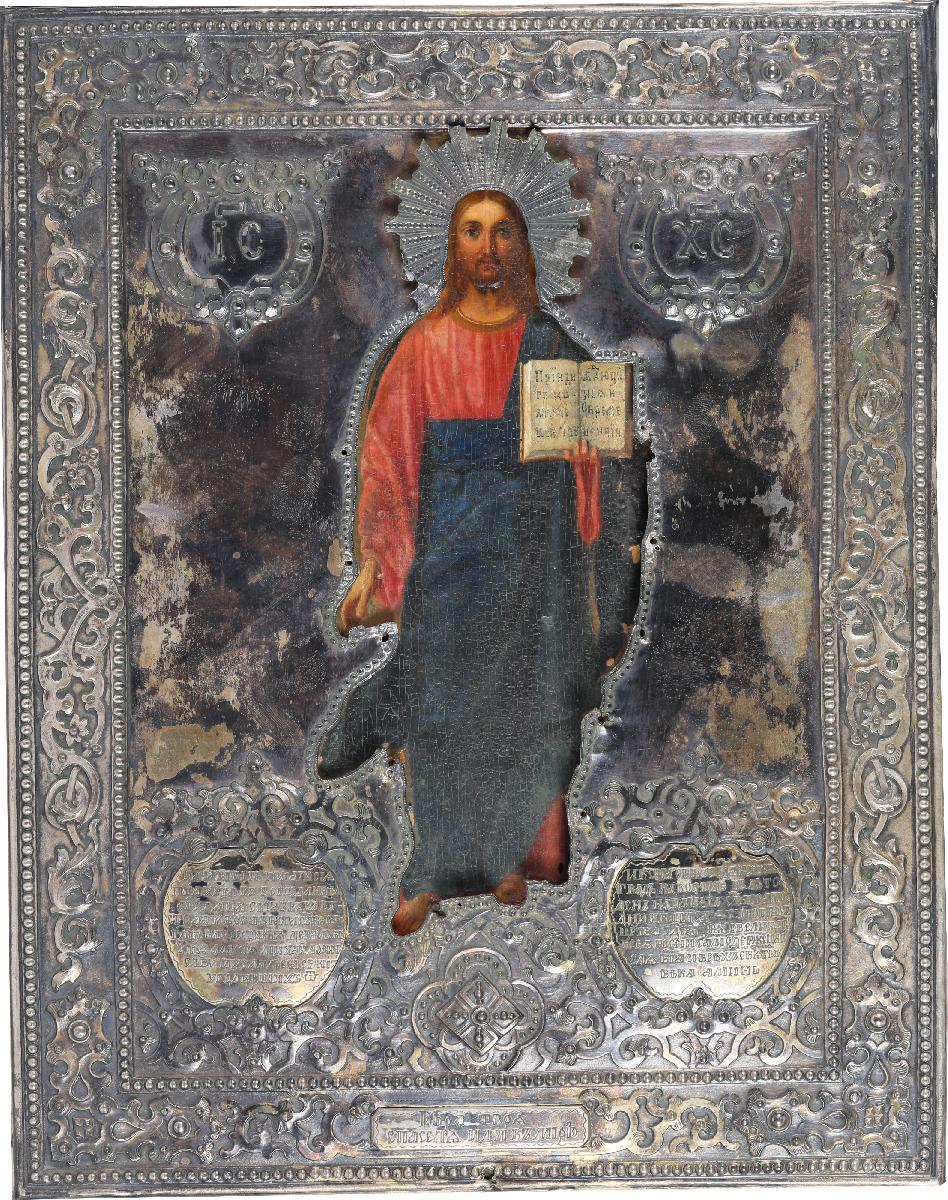 Серебряный оклад закрывает всю икону, кроме фигуры Христа. Чеканный орнамент на полях, поземе и вокруг дробниц составлен из переплетающихся лент-ремней со стилизованными растительно-цветочными мотивами. Границы полей и контур фигуры Спасителя обрамлены рядами рельефных точек, имитирующих жемчужную обнизь. Фон средника гладкий. Венец накладной, представлен в виде лучей-штралов разной длины, имитирующих божественное сияние. По обеим сторонам от фигуры Христа рельефные фигурные дробницы. Вверху – с монограммой Его имени «IС /ХС», на нижних дробницах приведен текст: ««Нчата бысть писати сiя//iиса хрта въ богоздания//ѿрут мца октября гi стола iякова брата гдь//гднь блгочестивыя державы//гдря алексiя михайловича//слвѵ мхалу вседержит//угодивших ѿ», «икона образъ гда нашего//градъ на вологде в лѣто//день на память стго//дни и написася сей образъ//црства гдря цря и великаго//всея россiи самодереца в//слѧ бга и всехъ святыхъ//века.аминь»……».