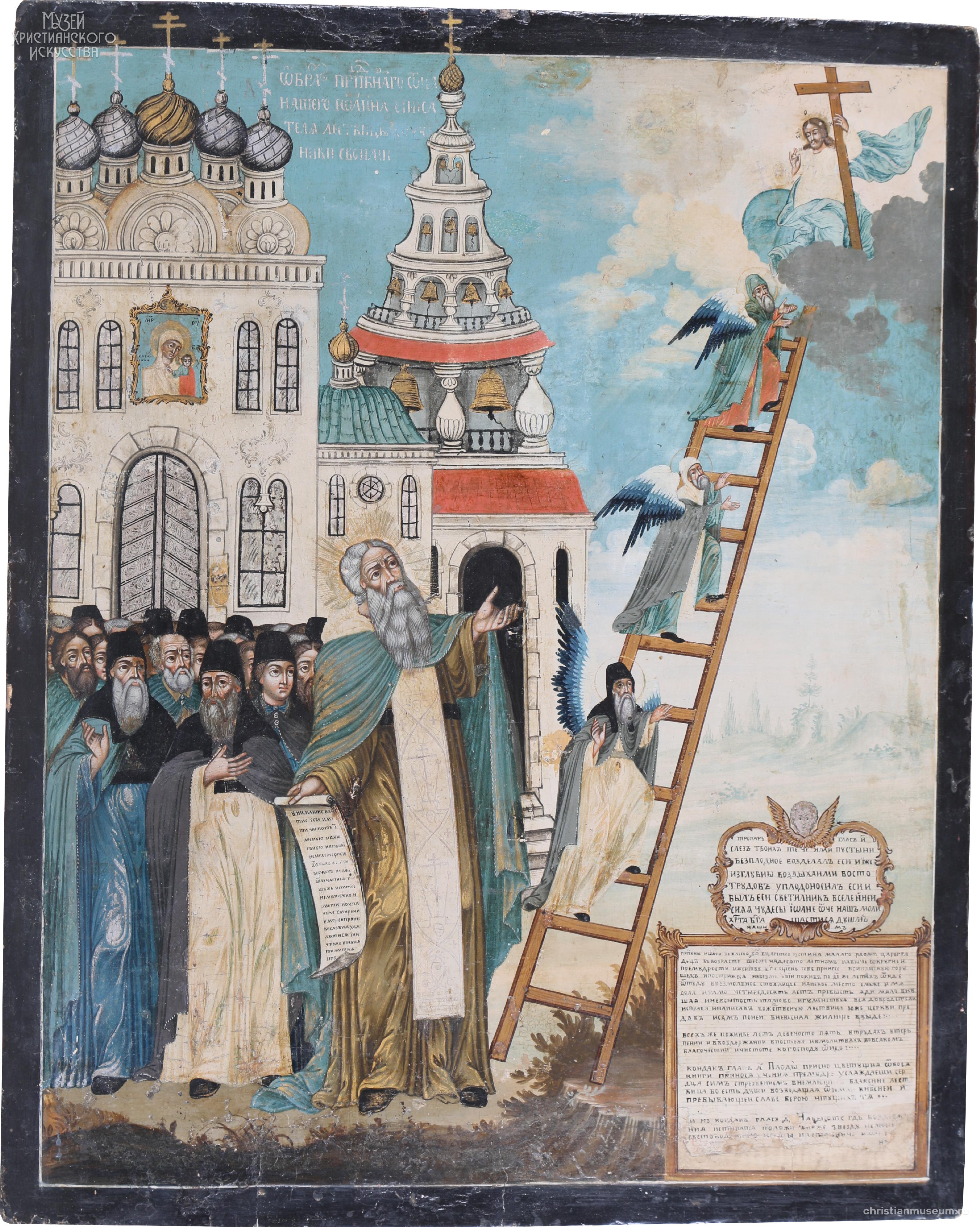На иконе внизу слева представлена группа монашествующих, которую возглавляет преподобный Иоанн Лествичник, фигура которого выделена масштабно. В правой руке он держит развернутый свиток с обращением к инокам: «Внимайте братие себе...». Левой рукой указывает на восходящих по лестнице праведников с крыльями, поднимающихся к восседающему на облаках Спасителю, поддерживающему Крест, благославляя восходящих по лестнице. Фоном для изображения в левой части иконы являются развитые архитектурные строения: пятикупольный храм с розетками в закомарах и многоярусная колоколня. В правой части иконы внизу расположены два картуша с текстами. За картушами в легкой дымке вдаль простирается пейзаж.