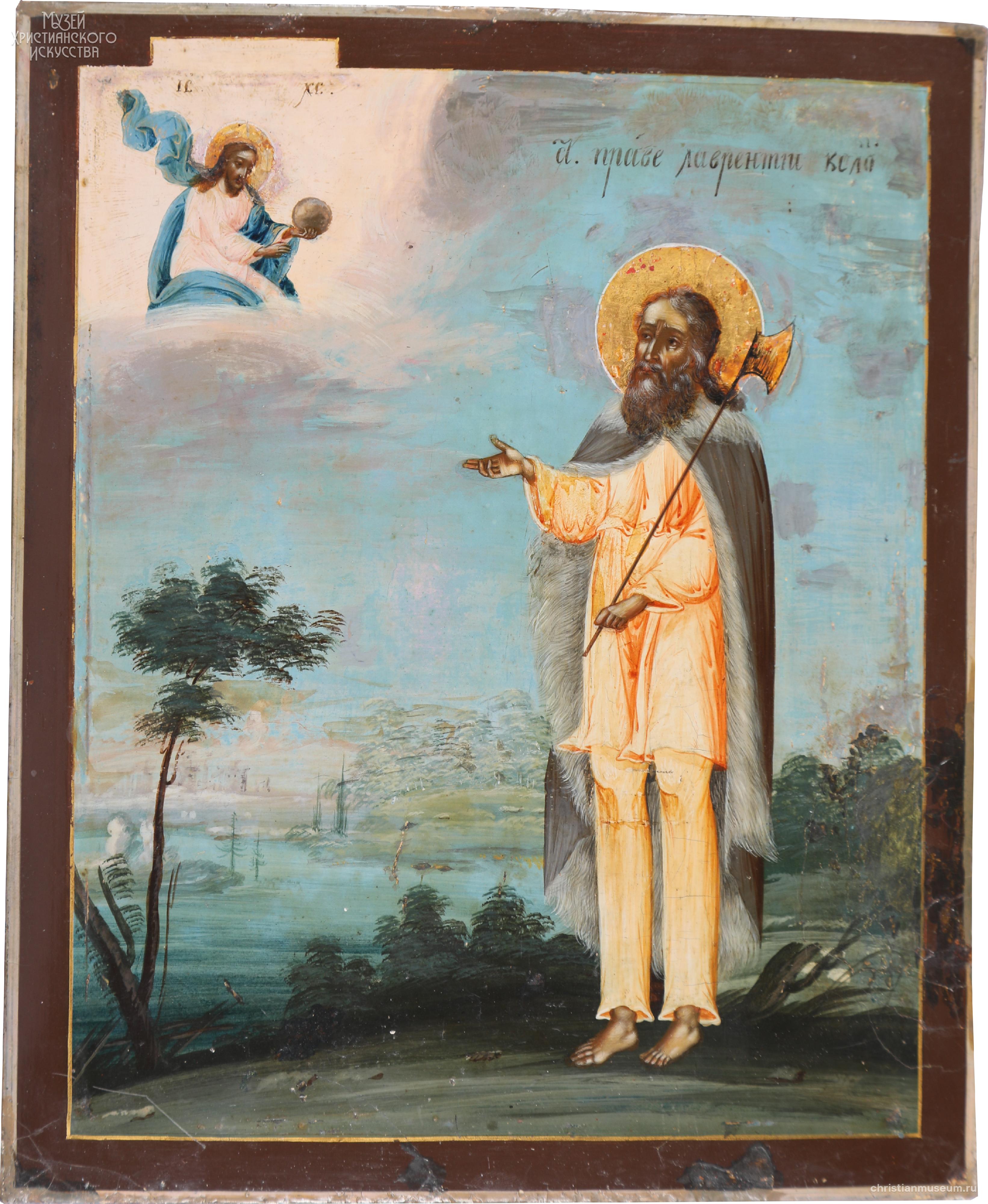 Святой праведный Лаврентий, Христа ради юродивый, калужский чудотворец, вероятно, происходил из боярского рода Хитрово. Судьба его связана с калужским князем Симеоном Ивановичем (1505-1518), сыном великого князя Ивана III. Часть времени святой Лаврентий жил при княжеском дворе, другую – проводил в уединении, в полуверсте от города у храма Рождества Христова. Ходил зимой и летом босым, в рубашке и в овчинном кожухе. Наиболее яркое прижизненное чудо блаженного – спасение града Калуги от «агарян» - крымских татар. Когда в 1512 году они угрожали городу, войско Симеона Ивановича вышло на бой. Вдруг, блаженный Лаврентий, находившийся в княжеских покоях, вскричал: «Дайте мне вострый топор, псы напали на князя Симеона, надобно оборонить его от псов». Выбежав из дворца, он неожиданно очутился на корабле князя Симеона и возгласом: «Не бойтесь!» - укрепил дух калужан, одержавших победу. Умер святой 10/23 августа 1515 года. Был похоронен в любимой им Христорождественской церкви. Вскоре на месте погребения святого был основан Лаврентьевский монастырь.