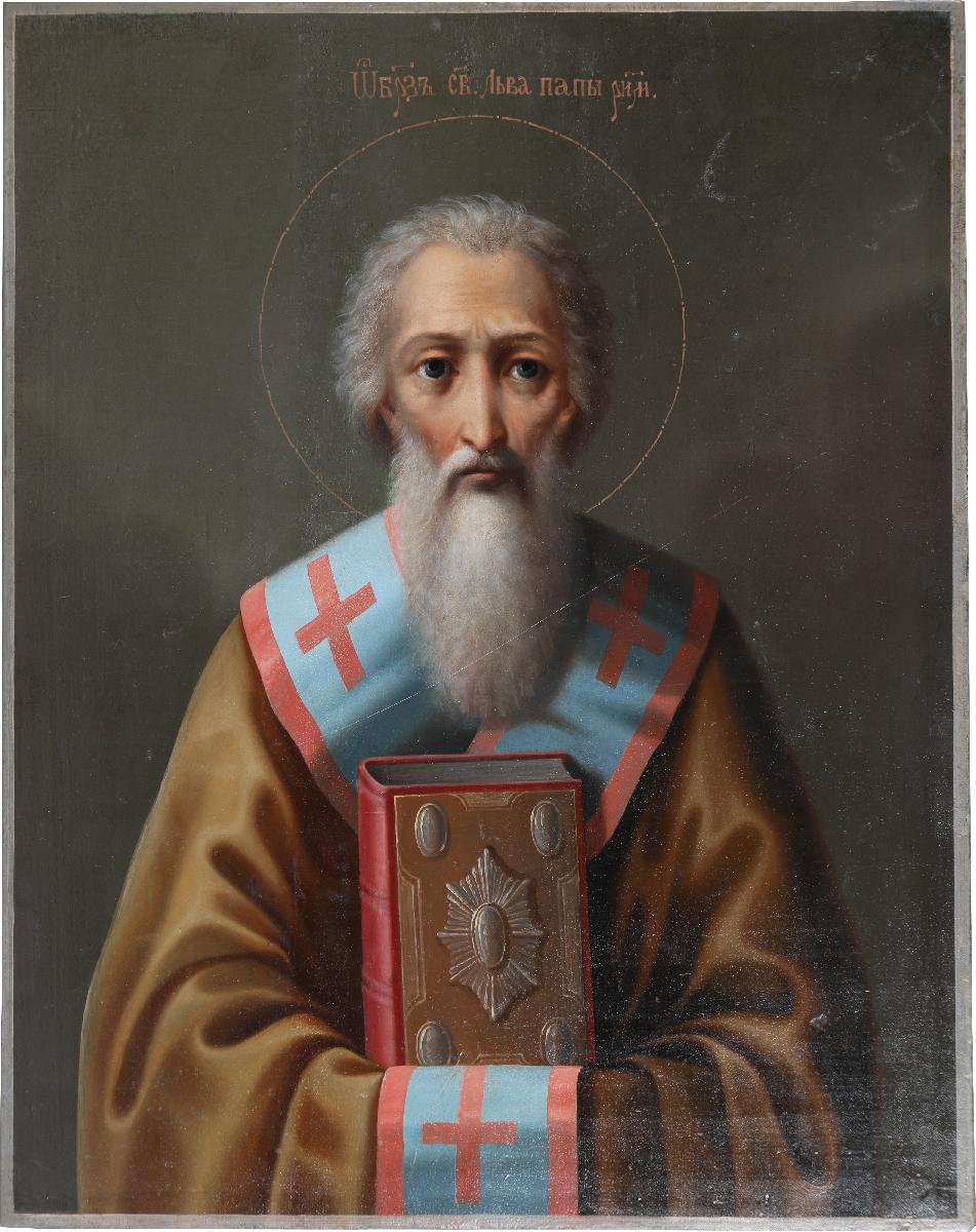 Святитель Лев представлен седовласым мужем с клиновидной бородой и слегка вьющимися волосами. На святителе фелонь горчичного цвета и омофор из синей ткани с окантовкой красными лентами. Крупные складки одежд создают впечатление тяжелой плохо драпирующейся ткани. В покровенных руках на уровне груди святитель держит Евангелие. Нимб плоскостно намечен тонкой прерывистой линией вокруг головы. Фон иконы нейтрально однородный с едва намеченным высветлением в верхней части. Лик святителя представлен с аскетично впалыми щеками, тонким носом, большими, круглыми, глубоко посаженными глазами. Лицо тронуто морщинами: горизонтальными на лбу, вилкобразной на переносице и веерообразными от уголков глаз. Письмо следует академической традиции.
