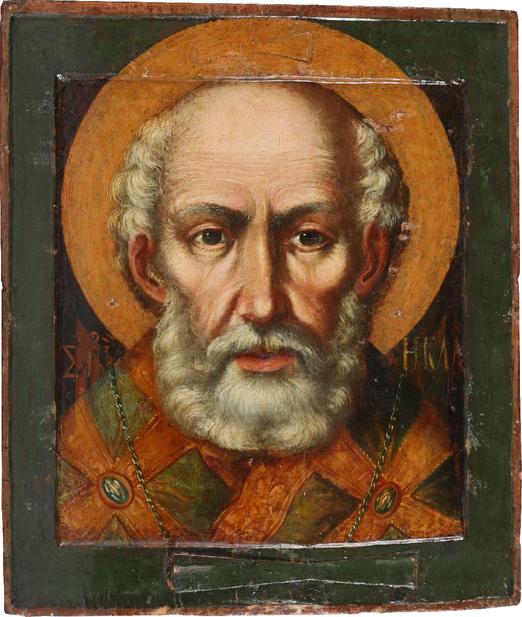 Святитель Николай представлен «оглавно». Лик святого и кресты омофора изображены крупно, заполняя собой всю плоскость средника.