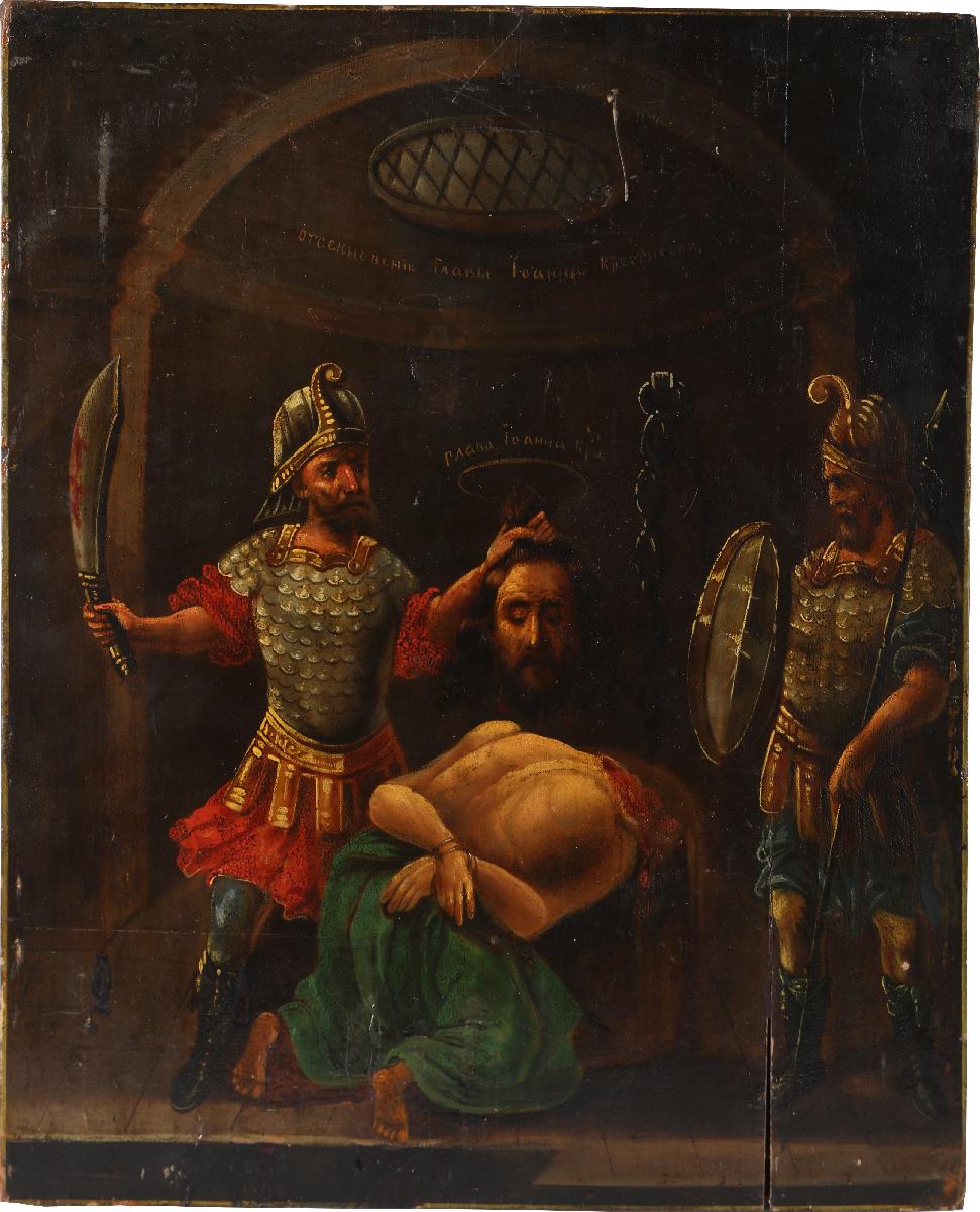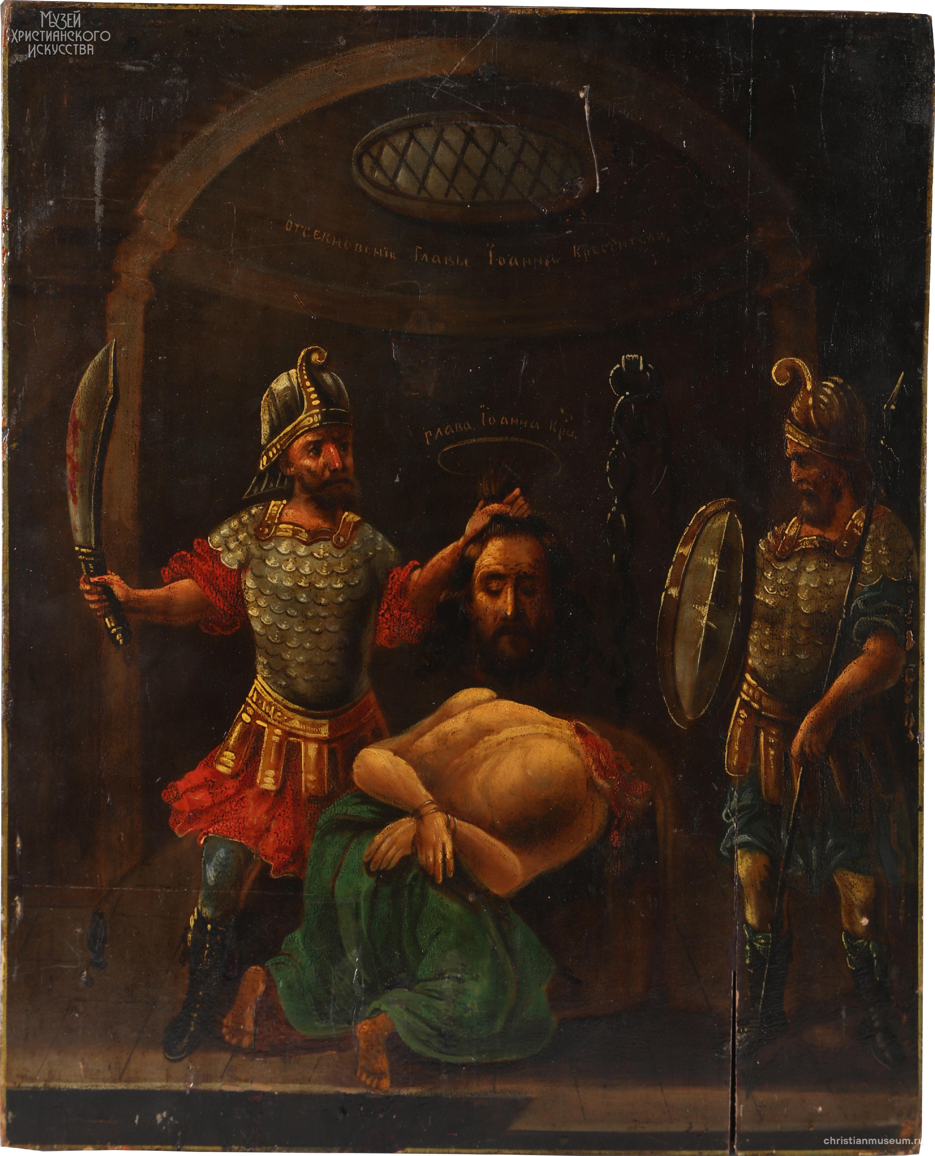 Выделение сюжета «Усекновения главы Иоанна Предтечи» из житийного цикла клейм в самостоятельную композицию в русской иконописи, по-видимому, произошло в конце XV столетия. Икона собрания ЦАК МДА представляет краткий вариант иконографии. Несмотря на явное влияние западноевропейских образцов в выборе позы Иоанна, одеяниях палачей, архитектурном фоне, образ соответствует ранней русской иконографической традиции, не включавшей в композицию изображение Саломеи. Икона принадлежит кисти провинциального художника, подражающего приемам академической живописи..