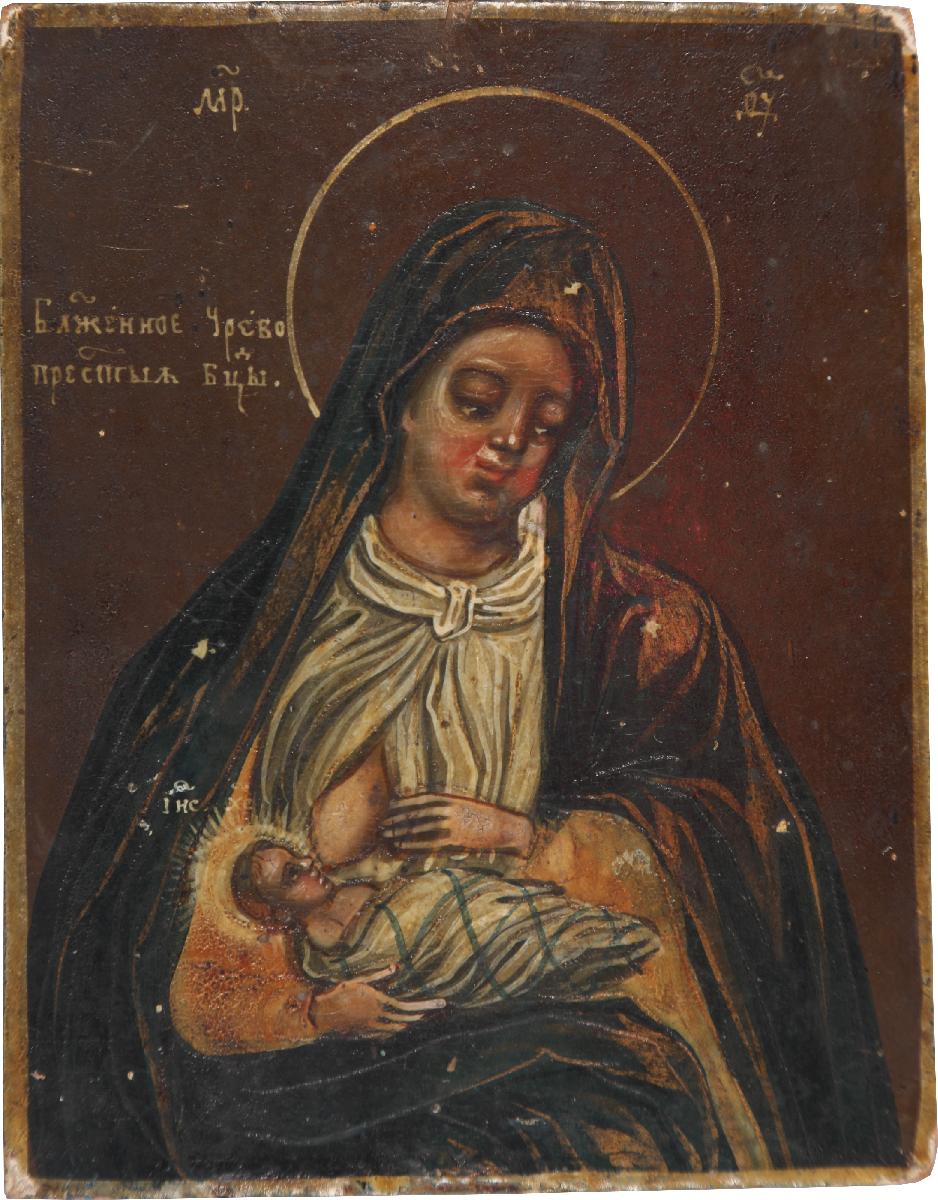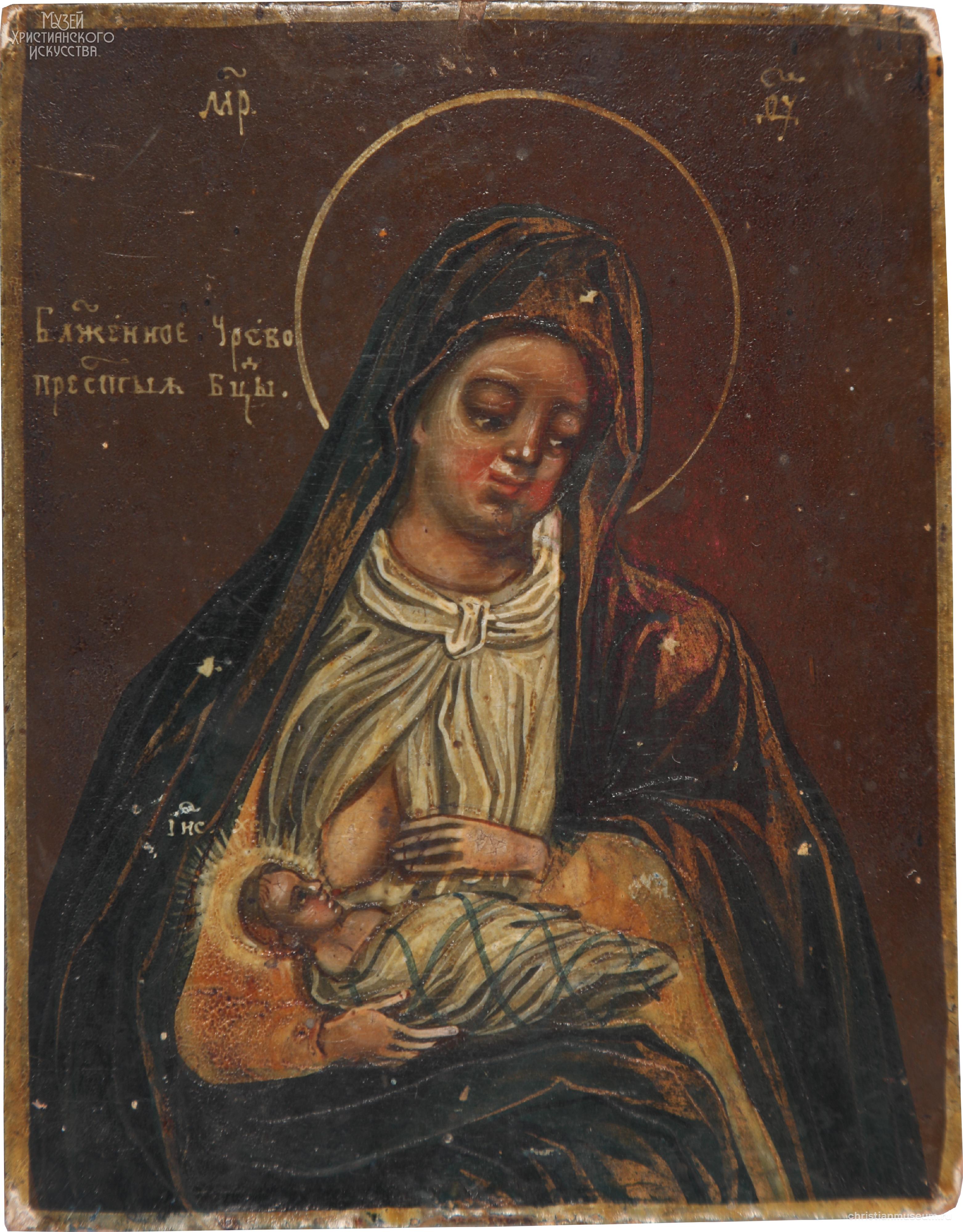 Образ относится к достаточно разнообразному иконографическому типу Богоматери Млекопитательницы. Несмотря на подпись на поле «Блаженное чрево Пресвятыя Богородицы» иллюстрирующию евангельский текст: «Блаженно чрево, носившее Тебя, и сосцы, Тебя питавшие» (Лк 11. 27).