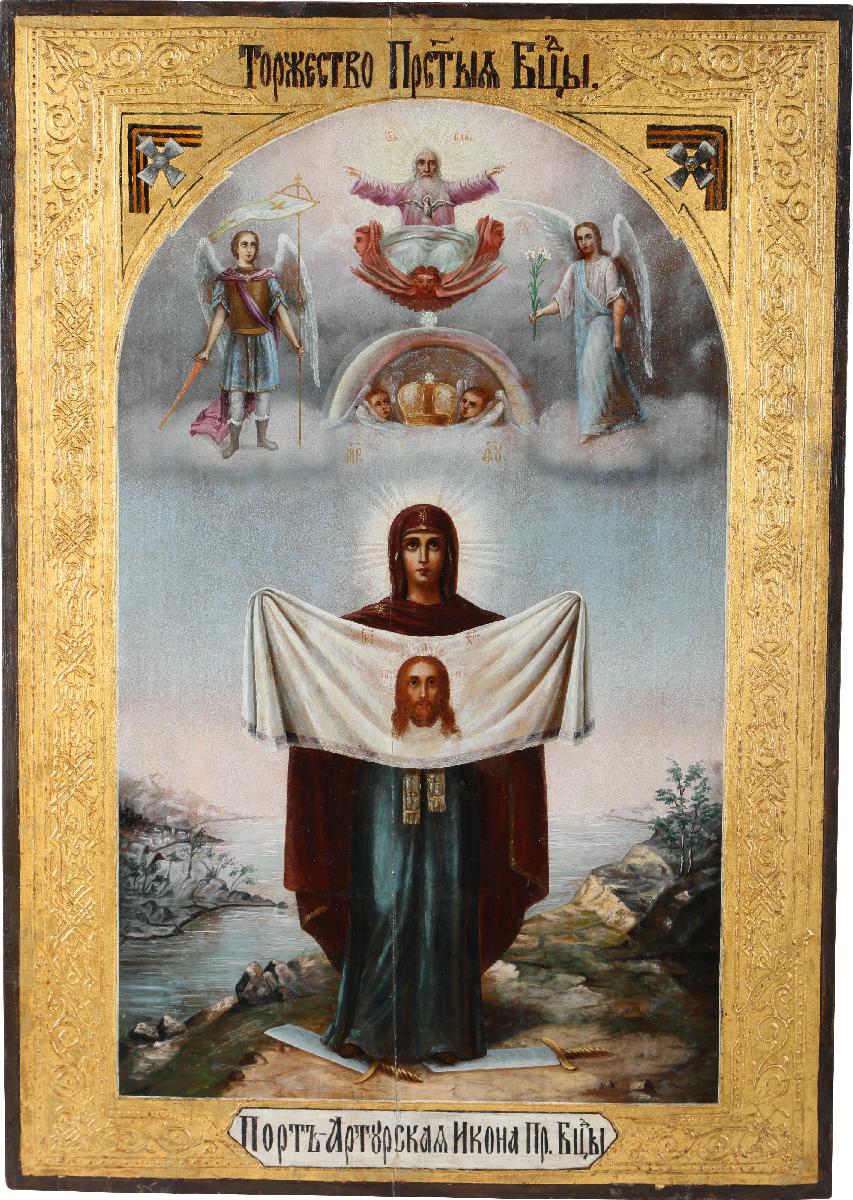 Чудотворная Порт-Артурская икона была написана в 1904 году киевским иконописцем Павлом Штрондом, по видению матроса Феодора Катанского. Ему в декабре 1903 года во сне явилась Богородица, подробно описала икону, которая должна быть создана, и велела доставить её в Порт-Артур для защиты города. Однако до нападения японцев 27 января/9 февраля на русскую эскадру, слова матроса не были восприняты всерьез. Затем медленно собирались деньги. На создание иконы ушло несколько месяцев. Потом из Киева образ был отвезен в Санкт-Петербург, затем – в Севастополь. Когда икона была доставлена на Дальний Восток, сообщение с Порт-Артуром уже было прервано. Икону на несколько месяцев оставили во Владивостоке. В конце ноября была предпринята попытка морским путем доставить её в Порт-Артур. Однако она закончилась неудачей, после чего следы иконы были на столетие утрачены. За время пребывания иконы в Киеве, Петербурге и Владивостоке с нее исполнялись многочисленные уменьшенные списки.