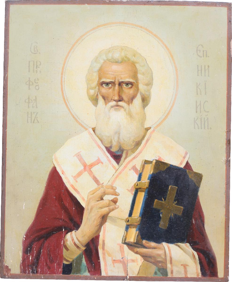 Поясное изображение старца в святительских одеждах (с крестчатой лентой омофора) с Евангелием в левой руке. Жест правой благословляющей руки направлен на Книгу. В надписи святой назван Преподобным Феофаном, епископом Никейским.