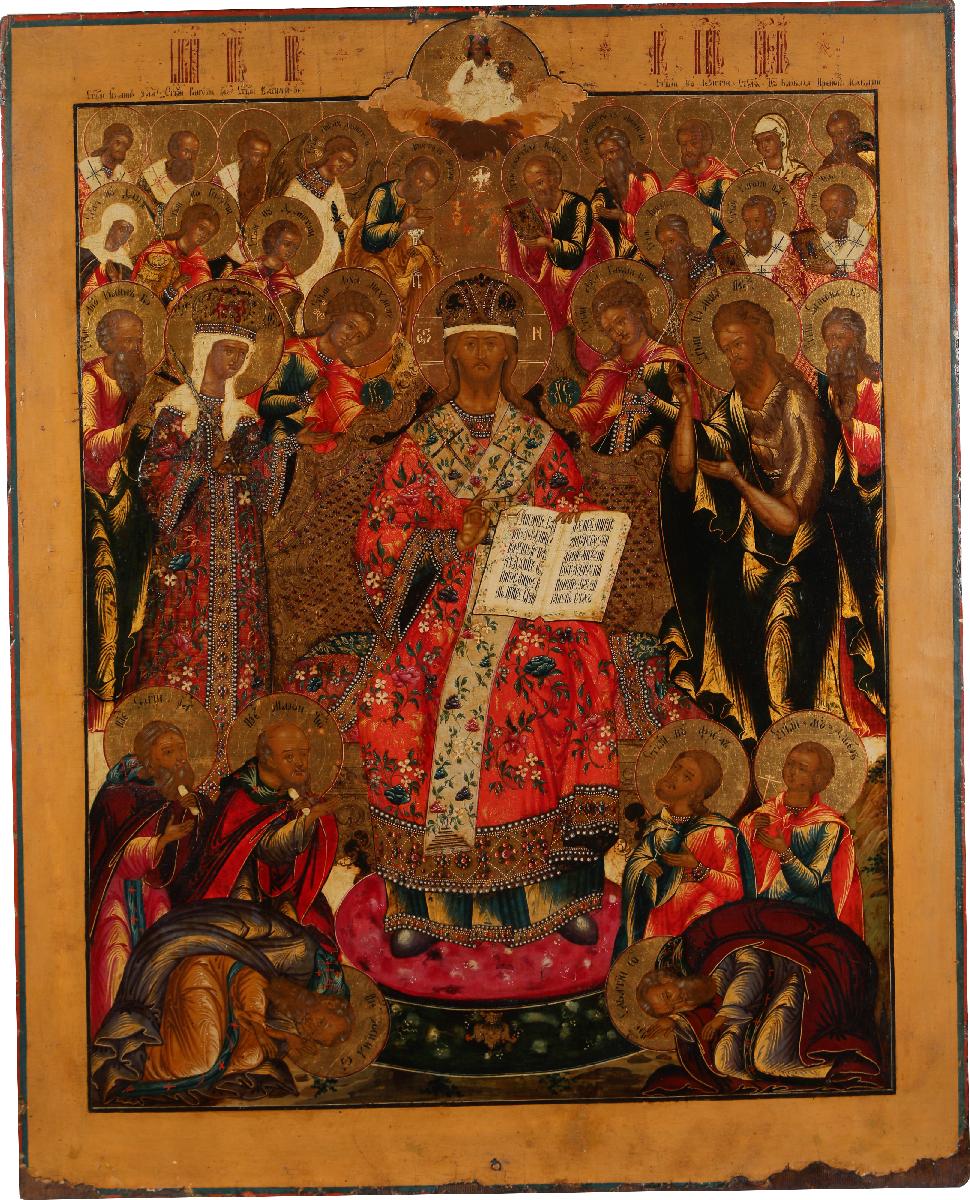В центре композиции представлен Иисус Христос в архиерейском облачении (саккосе, омофоре и митре), восседающий на престоле. Правой рукой он двуперстно благословляет, в левой - держит раскрытое Евангелие. Над Христом в облаках - полуфигура Господа Саваофа, между ними – белый голубь – символ Святого Духа. По сторонам от престола – многочисленные молящиеся. Ближайшими к трону стоят Богоматерь в царском облачении с венцом поверх плата и скипетром в руке и Иоанн Предтеча. За ними – апостол Иоанн Богослов и праведный Симеон Богоприимец. За престолом стоят два архангела с зерцалами. В верхнем ряду слева: святители Иоанн Златоуст, Григорий Богослов, Василий Великий, Ангел хранитель, апостол Петр; справа: апостолы Павел и Андрей, мученик Леонтий, мученица Варвара и преподобный Макарий. Во втором ряду слева: мученица Дария и великомученики Георгий и Димитрий; справа: три святителя из которых предположительно опознаются Григорий Назианзин Старший (?) и Николай Мирликийский. Ниже – коленопреклонённые преподобные Сергий Радонежский и Марон чудотворец слева и мученики Флор и Лавр справа. У ног Христа – преподобные Зосима и Савватий Соловецкие.