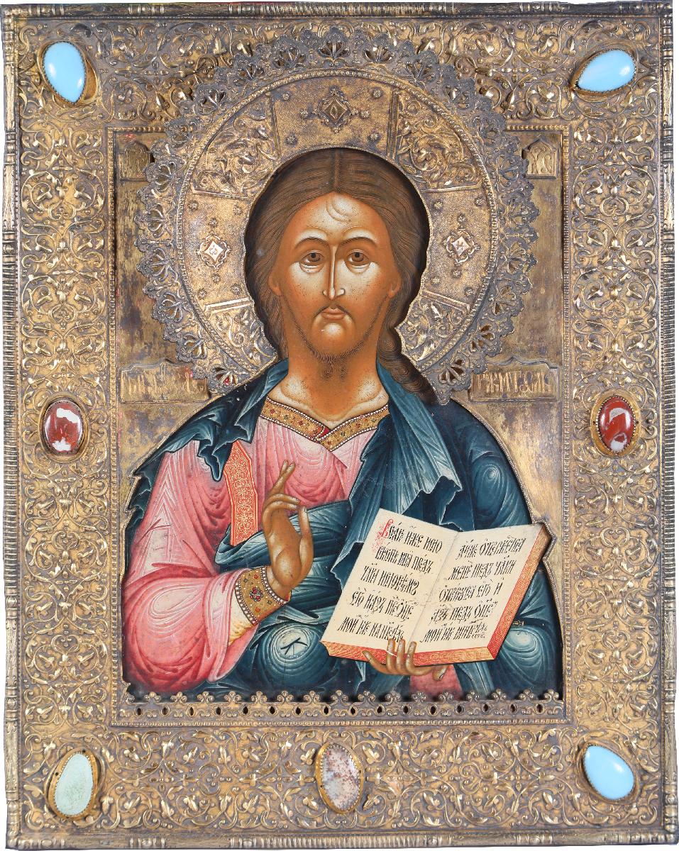 Серебряный оклад закрывает всю икону, кроме фигуры Спасителя. Декоративное оформление оклада выполнено в орнаментальных традициях золото-серебрянного дела XVII века. Внешний край оформлен полыми «трубами», рама и накладной венец украшены чеканным орнаментом из стилизованных растительных завитков. Особую выразительность произведению придают крупные кабошоны природных камней, создавая цветовые акценты на полях оклада. Венец по вешнему краю обрамляет ажурная орнаментальная кайма. На гладком фоне средника прочеканены фигурные дробницы с теонимограммой Христа - «IС / ХС» и наименованием образа - «ГДЬ ВСЕДЕ / РЖИТЕЛЬ».