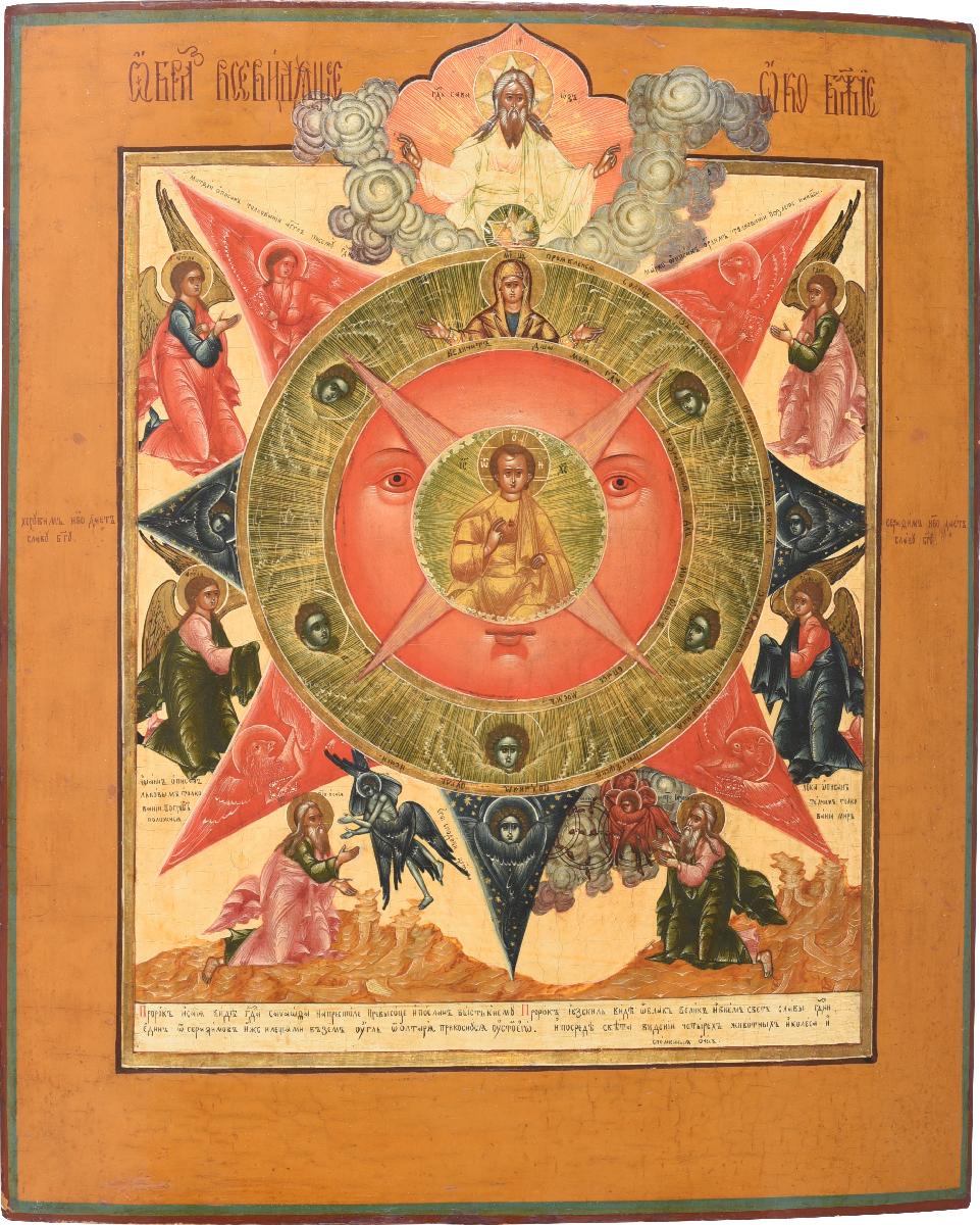 Изображение Христа-Эммануила во славе основано на видении пророка Иезекииля и известно с конца V – начала VI века. Вслед за двухсторонней охридской иконой 1395 года, русская икона второй половины XVI столетия, происходящая из ризницы Соловецкого монастыря (ныне в Музеях Московского Кремля) воспроизводит это видение в виде образа Христа-Эммануила, в окружении мандорлы из нескольких концентрических кругов. В нижней части композиции представлены пророки Иезекииль и Исайия. Однако иконография «Всевидящего ока Божия» окончательно сформировалась лишь на рубеже XVIII-XIX веков в старообрядческом искусстве. Ее название восходит к строфе псалма: «Вот око Господне над боящимися Его и уповающими на милость Его» (Пс. 32:18). Изображения пророков в этой композиции не были обязательны. Вероятно, они были основаны на зрительно близкой иконографической схеме образа Богоматери «Неопалимая купина», также предполагавшей крупное изображение, вписанное в звезду из двух ромбов.