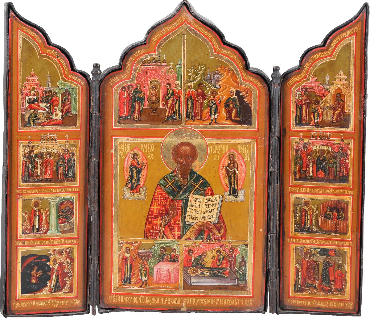 Складень работы палехских живописцев иллюстрирует отличительную черту этих мастеров-миниатюристов. В центральной части традиционное поясное изображение святителя Николая с ростовыми фигурами Христа и Богоматери,парящих на облаках (Никейское чудо). Житийный цикл разворачивается на всех створках и прочитывается по устоявшемуся принципу: порядно сверху-вниз, слева-направо. Сюжеты с поставлением Святителя в диаконский и священнический чины оказываются сопоставленными на боковых створках. Эти сцены озвучиваются надписью «АКСИOС" (в переводе с греческого «Достоин»), возгласом епископа согласно чину поставления в эти степени священства.