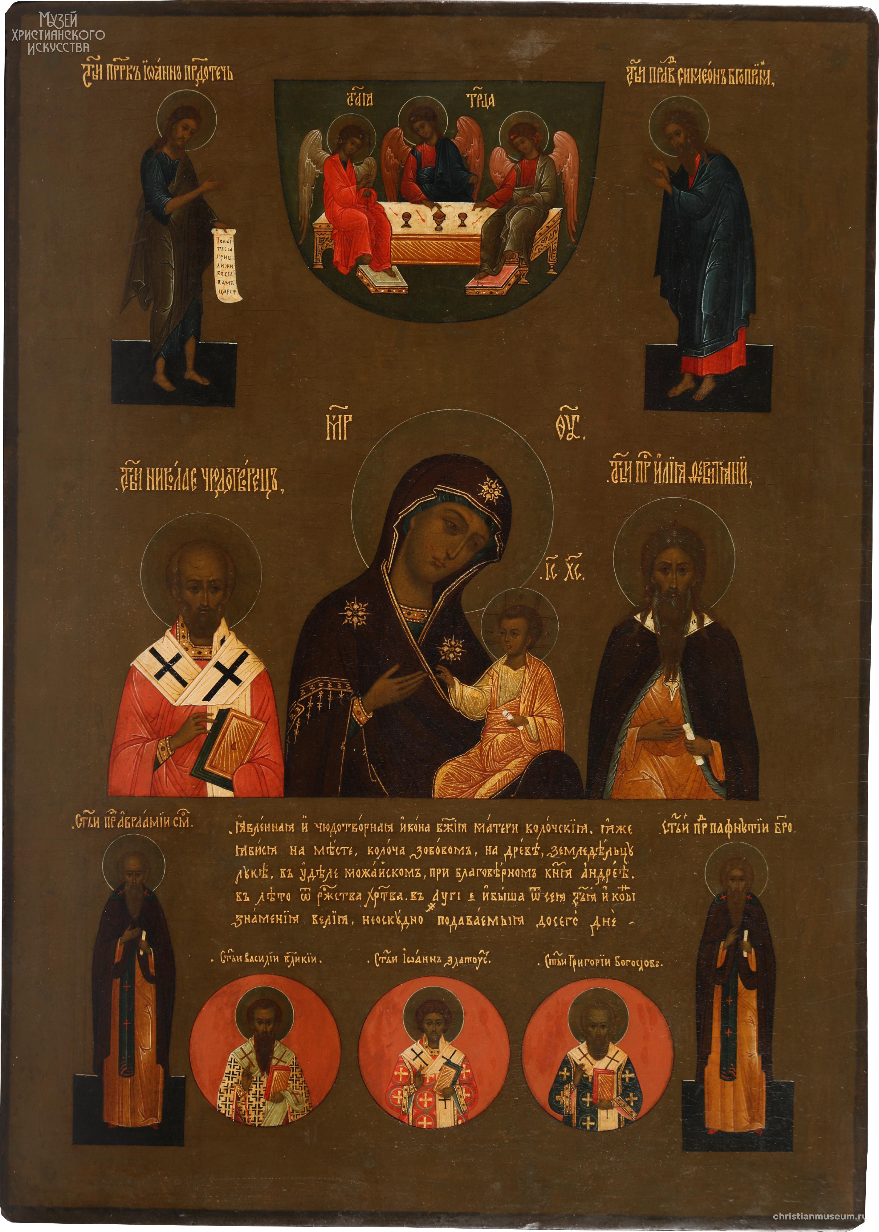 Образ принадлежит к типу Одигитрии, отличается слегка склоненной в сторону Младенца главой Богоматери, а также рисунком краев мафория на Ее груди. Особенностью колочской иконы было наличие боковых створок, на которых представлены святитель Николай и пророк Илия. На исследуемой иконе святые помещены по сторонам от центрального образа Богородицы. В верхней части иконы - «Ветхозаветная Троица», слева - Иоанн Предтеча, справа - праведный Симеон Богоприимец. В нижнем регистре в медальонах представлены три вселенских святителя - Василия Великий, Григорий Богослов, Иоанн Златоуст, по сторонам от них - преподобные Авраамий Смоленский и Пафнутий Боровский. Икона, как это следует из текста надписи на ее обороте, была создана по заказу жителей Можайска в 1897 году. Стиль ее письма, ориентированный на образцы древнерусской иконописи, полностью соответствует стилю, принятому в ведущих московских иконописных мастерских, основанных в конце XIX века выходцами из села Мстера, Владимирской губернии (В.П. Гурьяновым, М.И.Дикаревым, И.С. Чириковым)