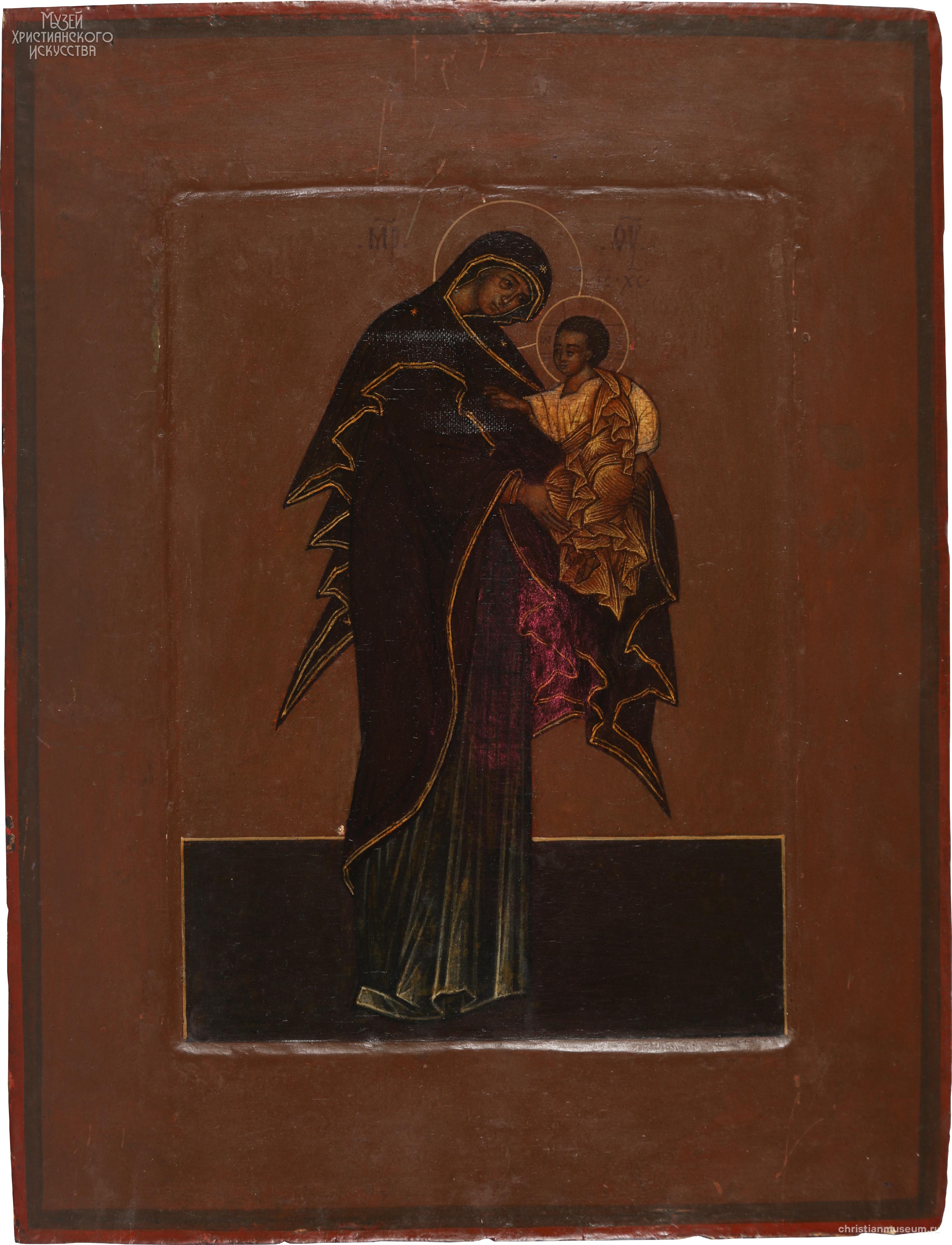 Это достаточно редкий в русском искусстве иконографический тип, который можно считать одним из вариантов «Одигитрии», поскольку Христос представлен благословляющим, а не обнимающим Богородицу. Вероятно, подобные изображения иконографически связаны с монументальными образами, располагавшимися на столпах или в узких простенках, подобно ростовому образу Богоматери Одигитрии монастыря Хора (Кахрие-Джами, 1313 год. Константинополь). Публикуемая икона наиболее близка образу Богоматери XV - XVI столетия, хранящемуся в монастыре Пантократора на Афоне. Известен, как минимум, один древний русский список с этой иконы – в собрании Сергиево-Посадского музея-заповедника, однако отличающийся одеянием Христа и положением Его левой руки. К концу XIX века на иконах этого иконографического типа иногда стали появляется надписи «Моденская» (икона из собрания Н.П. Лихачева; зеркальная прорись из собрания Ивановского областного художественного музея). На самом деле, икона почитаемая как Моденская-Косинская, которую считали привезенной из города Модены (Италия), и которая хранилась в Успенской церкви подмосковного села Косино с 1717 года (празднование 20 июня/3 июля), не совпадает по типу с данной группой икон. На ней, действительно, Богородица также представлена в полный рост в трехчетвертном повороте вправо, однако Младенец обращен от Матери и благословляет не Ее, а невидимых зрителю предстоящих, оставшихся вне иконного поля.