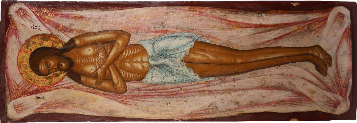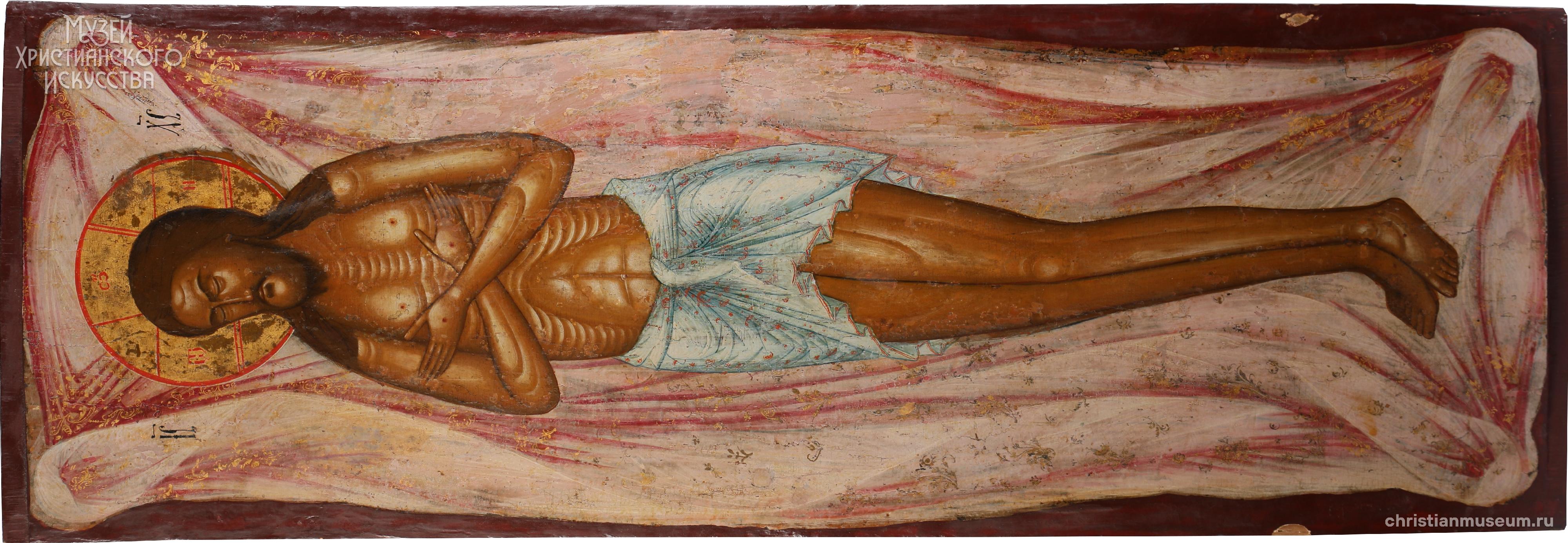 Образ Христа на плащанице является центральной частью иконографии Положения во гроб. Этот сюжет с древних времен помещается на шитых плащаницах, выносящихся на поклонение из алтаря в храм в Страстную Седмицу. Горизонтальная направленность доски свидетельствует о том, что публикуюмая икона могла быть использована в качестве основы для выноса шитой плащаницы за богослужением в Страстную Пятницу. Фигуры Богородицы, Марии Магдалины и других оплакивающих Христа на ней отсутствуют, как нередко и на тканых плащаницах с живописными вставками личного, созданных в Новое время. В настоящее время образ из собрания музея не имеет аналогов среди выявленных памятников в музейных и церковных собраниях и может считаться уникальным. Письмо иконы отличается линейной графичностью, личное написано в несколько жесткой манере, подражающей древним образцам. Колорит в целом тяготеет к высветленным тонам. Указанные особенности, характерны для русской иконописи эпохи классицизма, что позволяет датировать памятник первой половиной XIX столетия. Вытянутые пропорции, особенности колорита, разделок личного и складок тканей позволяют предполагать, что икона была написана в одном из иконописных центров Владимирской губернии.