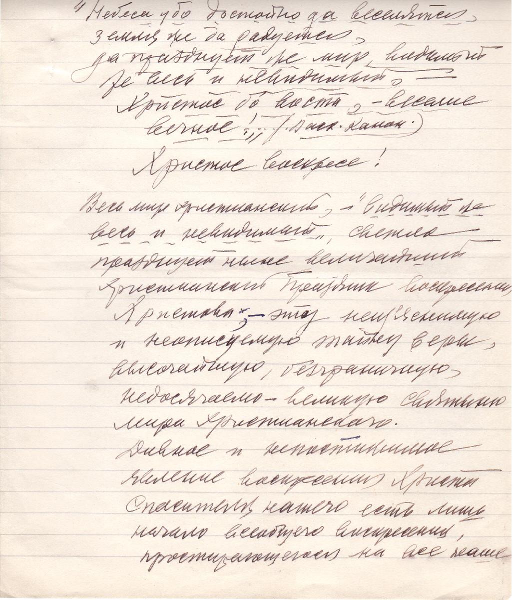 На шести листах линованной бумаги патриарх в канун своей смерти написал черновик к проповеди, которую намеревался произнести на Пасху 1970 года. В тексте присутствуют ссылки на мысли святых отцов с указанием их сочинений.