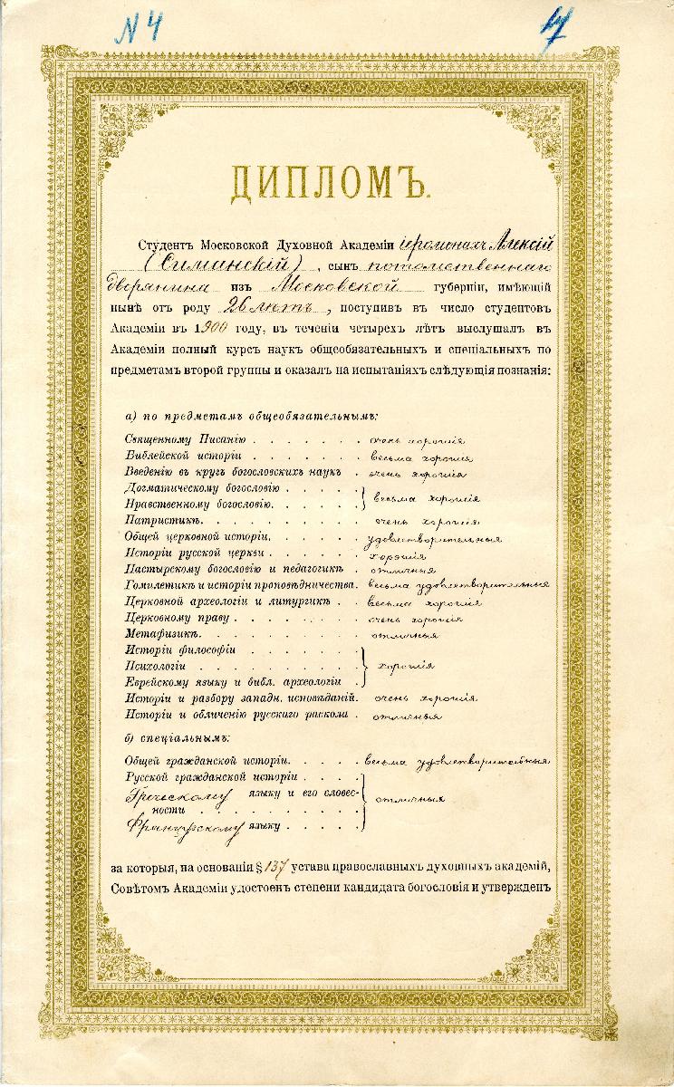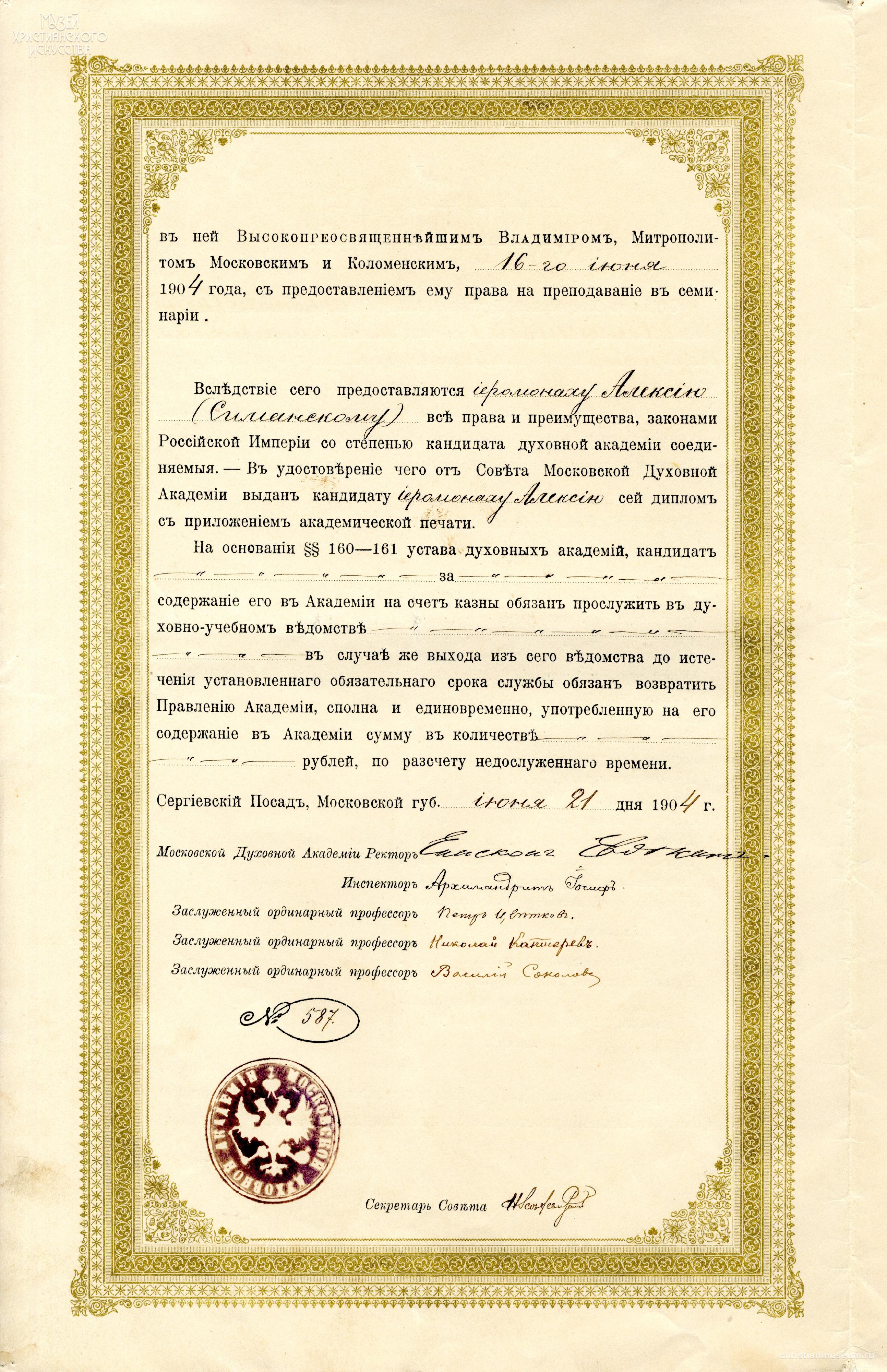 Диплом об окончании четырехлетнего обучения в Московской духовной академии. Кроме испытательных оценок по дисциплинам содержит указание о возможности преподавания в семинарии. Подписан Ректором епископом Евдокимом (Мещерским), ординарным профессором Петром Цветковым, ординарным профессором Николаем Каптеревым, ординарным профессором Василием Соколовым