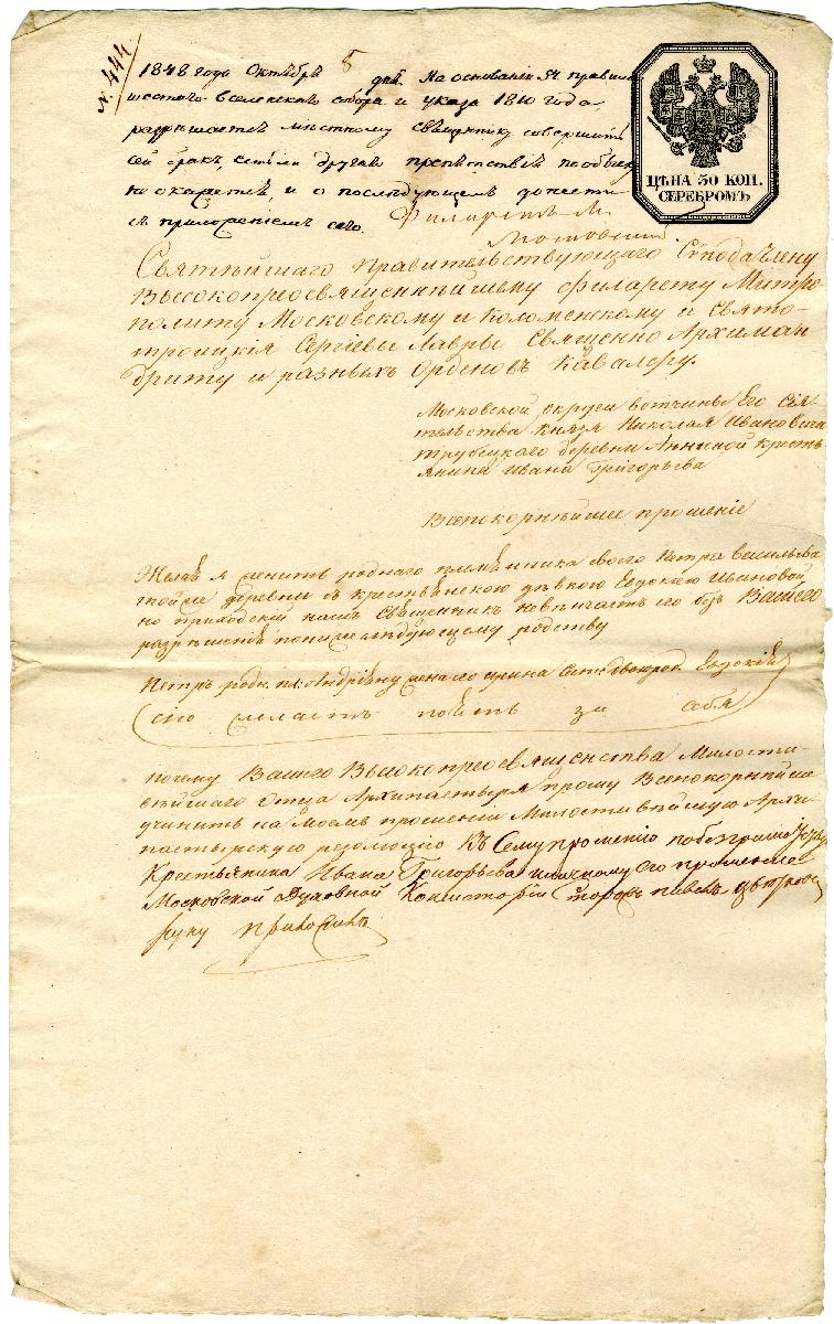 Прошение святителю Филарету (Дроздову) от крестьянина Ивана Григорьева с просьбой разрешить венчаться его племяннику Петру Васильеву с крестьянской девушкой Евдокией Ивановой, которая приходится молодому человеку двоюродной сестрой.