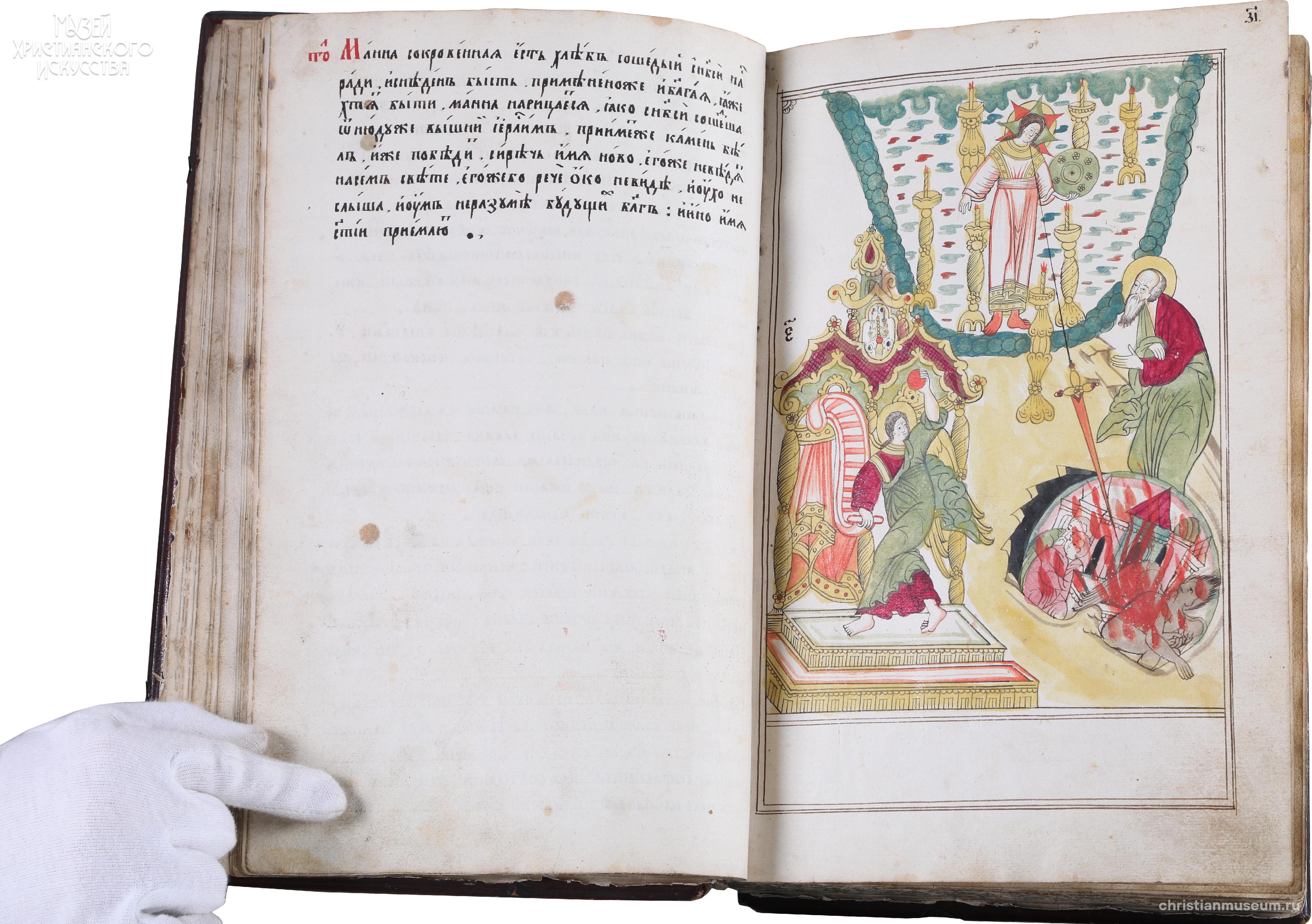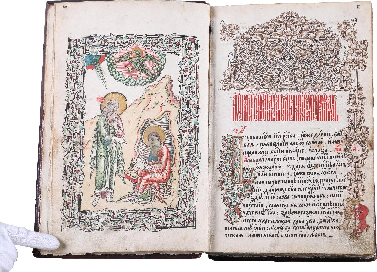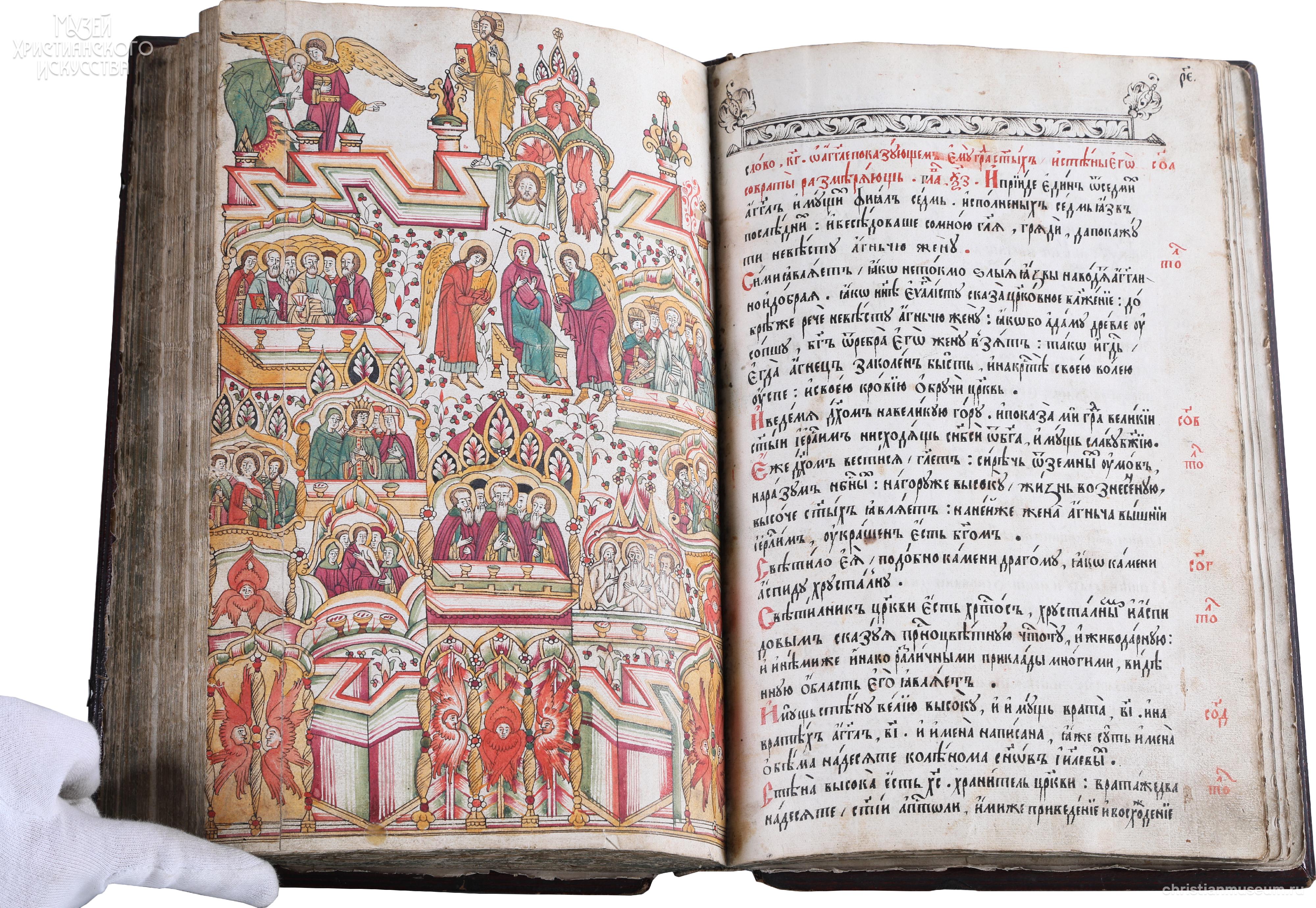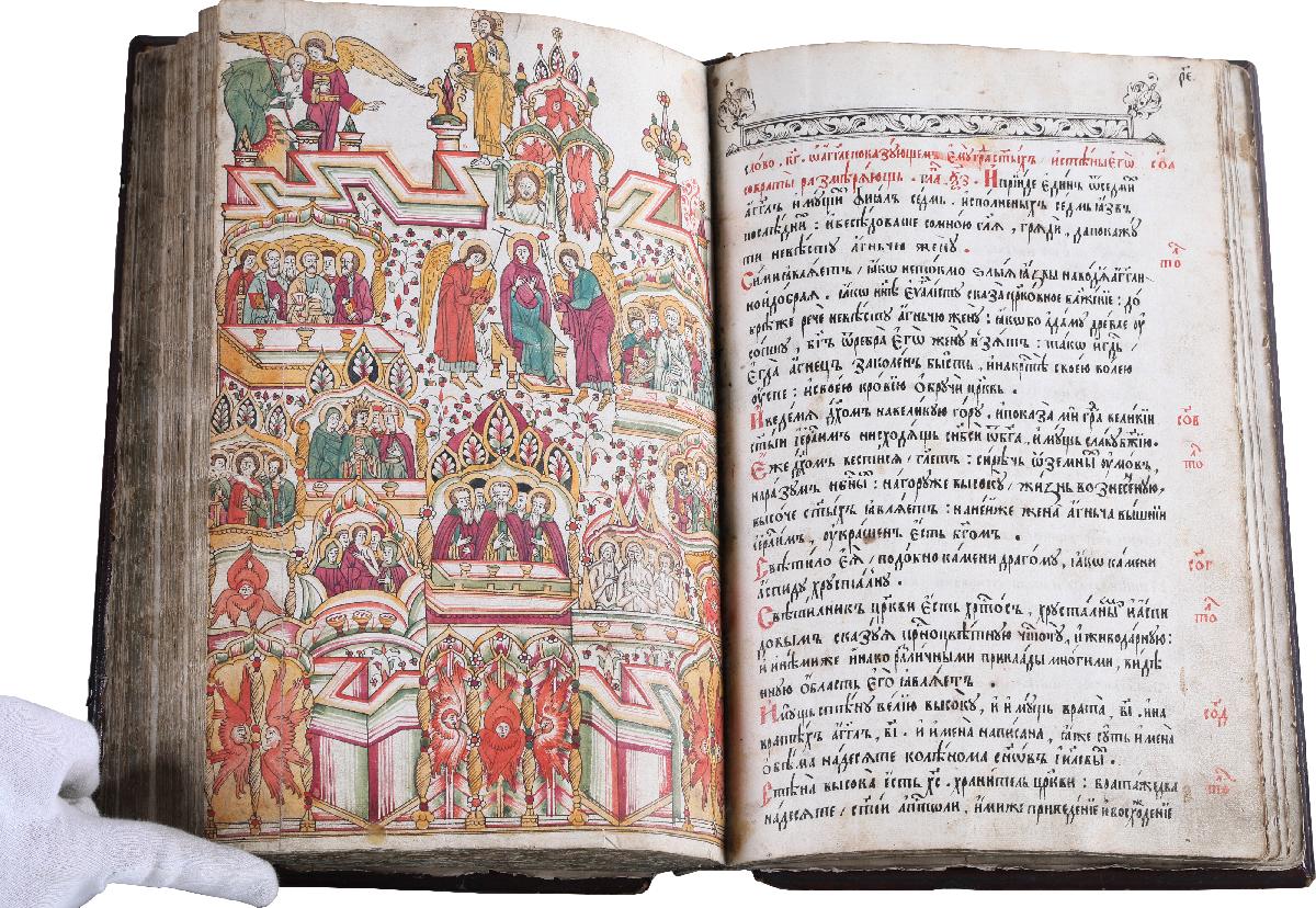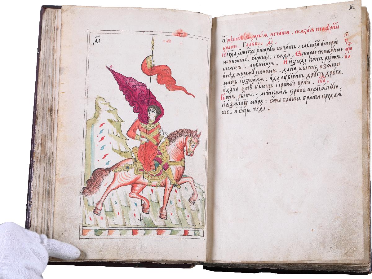 Апокалипсис или Откровение святого апостола и евангелиста Иоанна Богослова – самая загадочная и единственная пророческая книга Нового Завета, которая известна в русской рукописной традиции с середина XIII века. Особенностью русских рукописных Апокалипсисов было их сопровождение толкованиями святителя Андрея Кесарийского. Интерес к книге объяснялся ожиданием Второго Пришествия Христова, особенно усиливавшимся в определенные эпохи, к которым относится и вторая половина XVII века, когда была создана рукопись. В реформах патриарха Никона, а затем Петра I приверженцы старины видели грозные предзнаменования прихода антихриста. С этого времени Апокалипсис стал едва ли не главной книгой русского старообрядчества, распространившейся в многочисленных списках. Большинство из них относится к лицевым, т. е. содержит миниатюры.