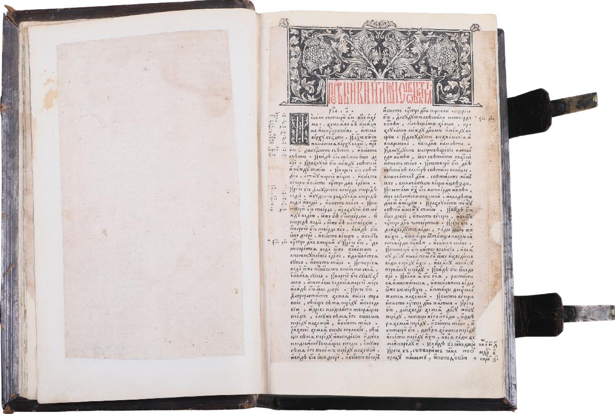 На л. 13 об., 15 об. 1-го сч. и ряде других мелкой каллиграфической западнорусской скорописью черными чернилами (XVI, XVII вв. ?) комментарии к тексту, частично срезаны. На л. I и ряде других штамп Б-ки. МПДА, инв. номер 19161. На л. 56, 57 посл. сч. и других киноварью полууставом маргиналии к тексту (XVII в.?).Ключевые слова: