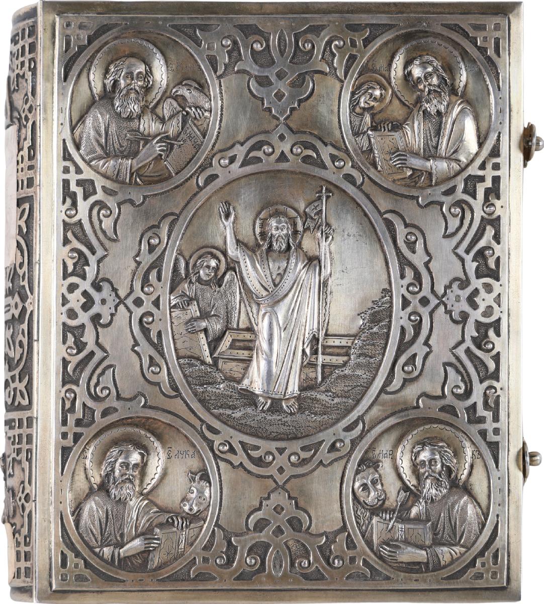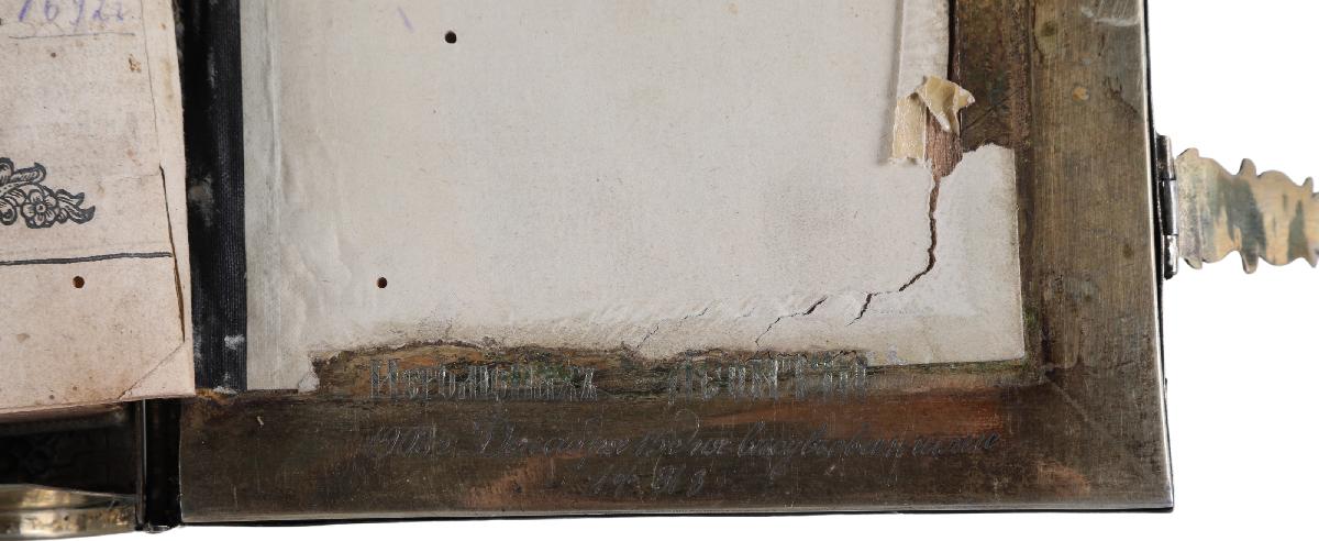 На внутренней стороне нижней крышки оклада чеканная запись: «Иеромонах Леонтий. 1903 г. Декабря 15 дня въсувъевангилие 1 ф 81 з».Ключевые слова: