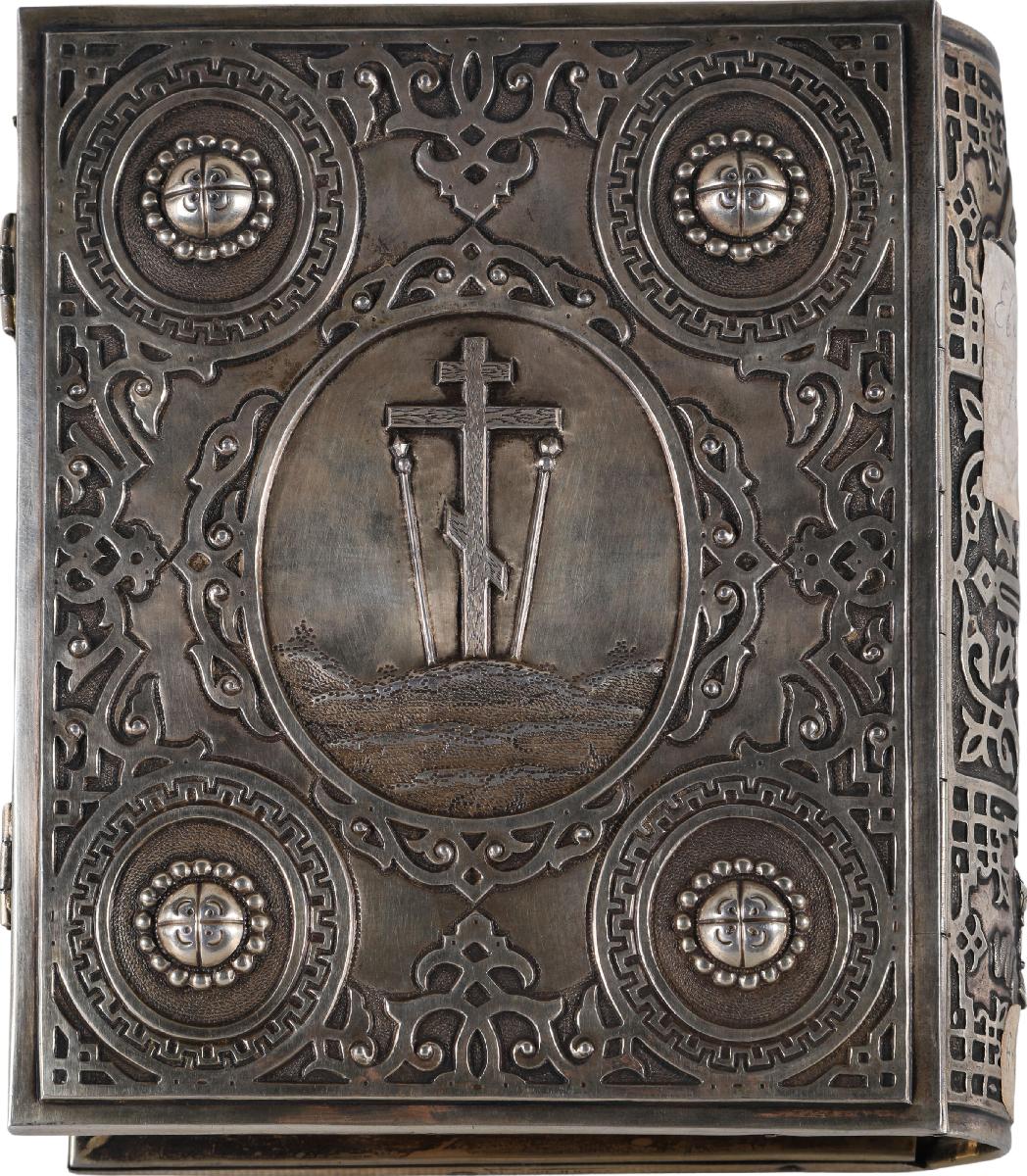 Доски переплета в сплошном серебряном окладе начала XX века. На нижнем поле нижней крышки гравированная владельческая надпись: «Иеромонахъ Леонтiй. 1903 г. Декабря 15 дня. Весу в Евангилие 1 ф 81 з». Застежки «внахлест». Обрез золотой. На корешке изображение потира, «Всевидящее око» и Четырехконечный крест.